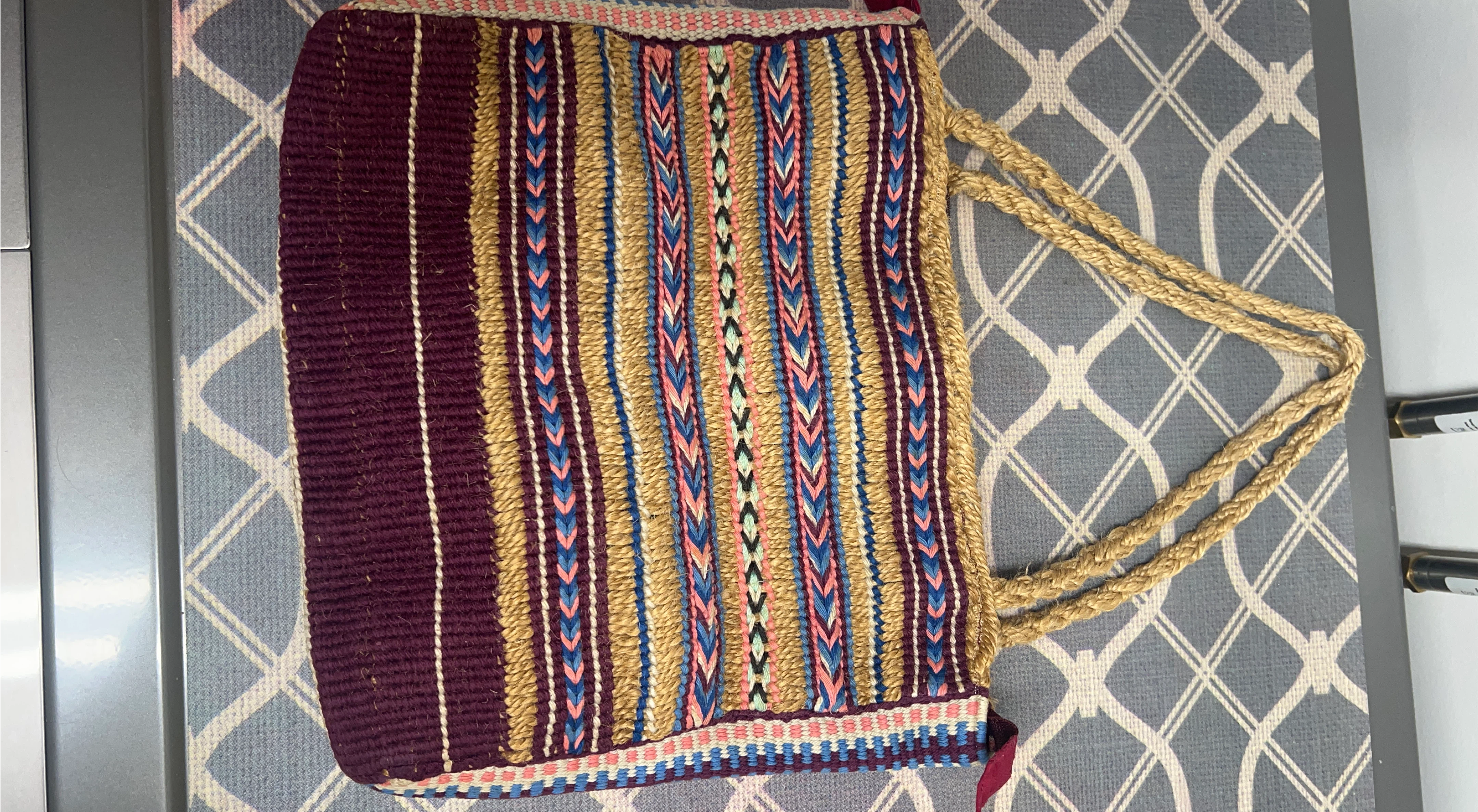 10Selling a unique handmade woven shoulder bag! It features a beautiful striped pattern with colours like purple, gold, blue, and pink. The handles are made of a sturdy, natural-looking fibre. It's perfect for adding a pop of colour and texture to your outfit