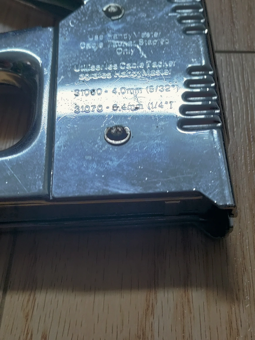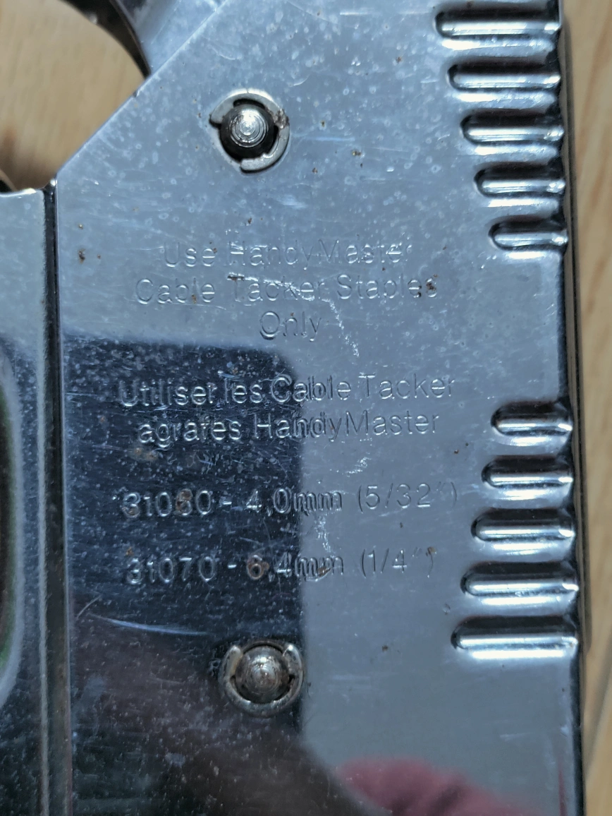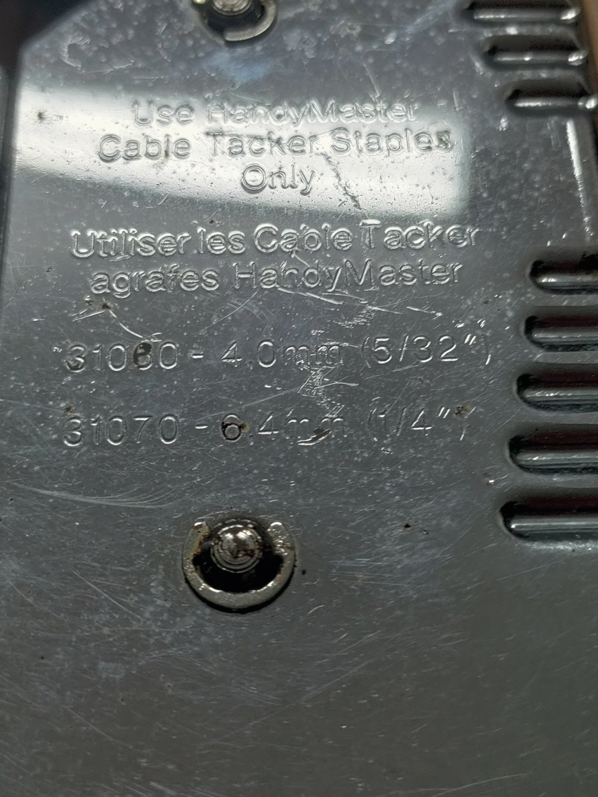 47Selling a HandyMaster cable tacker, model number 31050. It uses HandyMaster cable tacker staples only. It uses staples sizes 31060 - 4.0mm (5/32") and 31070 - 6.4mm (1/4")