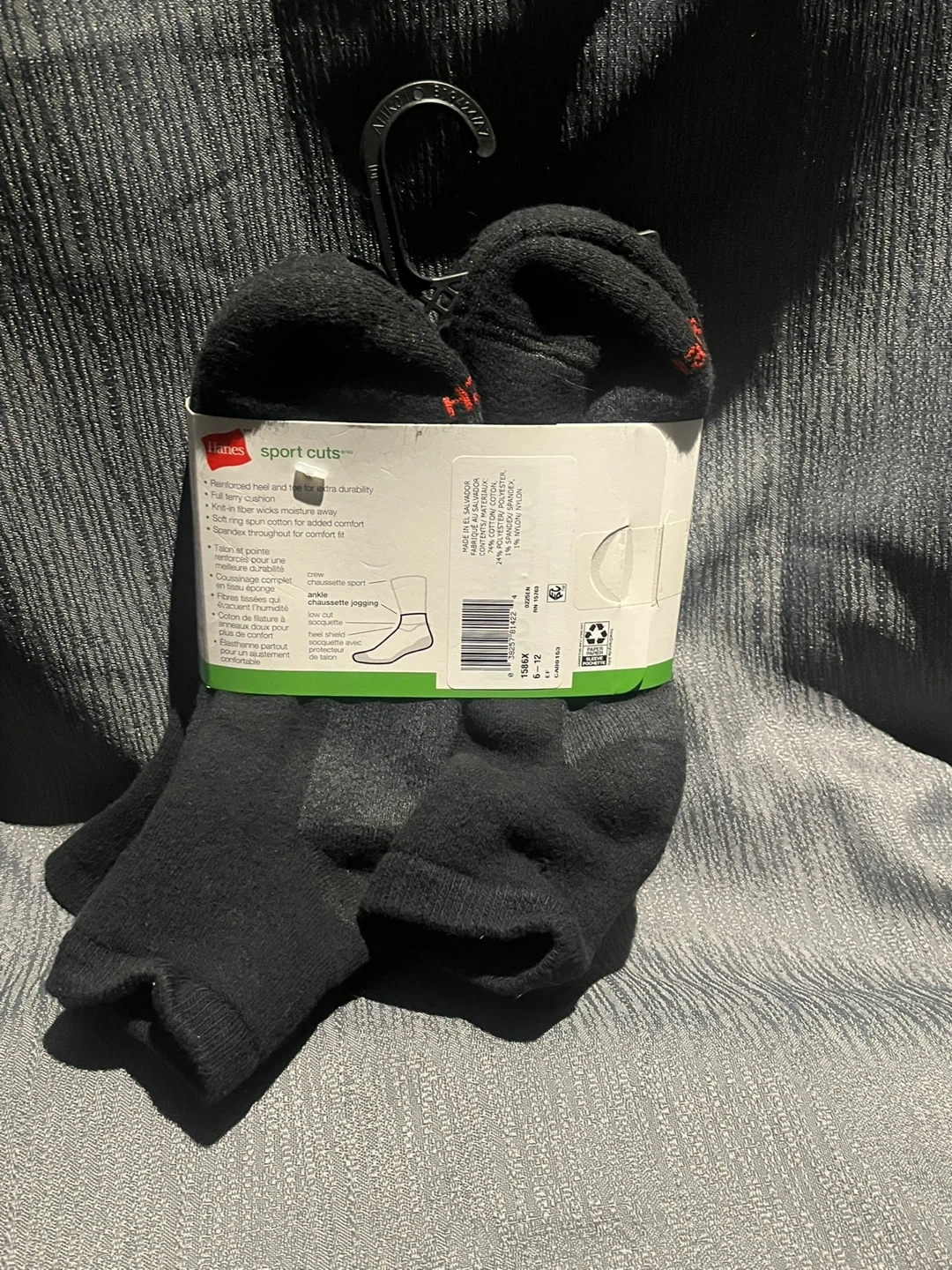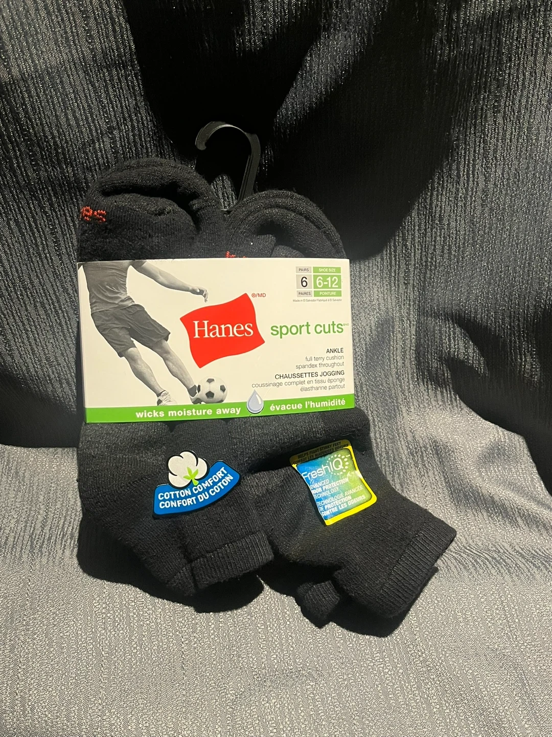 1000+I'm selling a pack of Hanes Sport Cuts ankle socks! They're black and size 6-12. These socks wick moisture away and have FreshIQ advanced odour protection. They also feature cotton comfort
