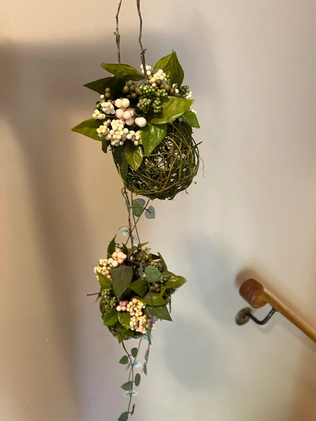 I'm selling a lovely hanging artificial floral decoration. It features a moss-covered sphere adorned with green leaves and clusters of white and pink berries. It would add a touch of nature to any room!