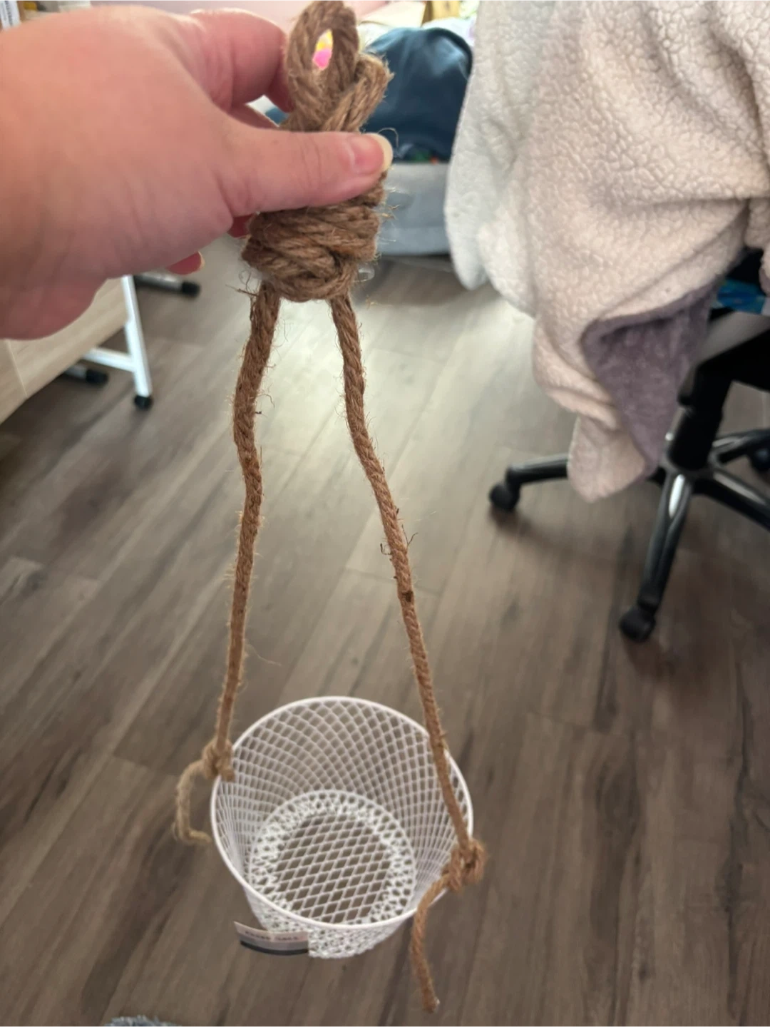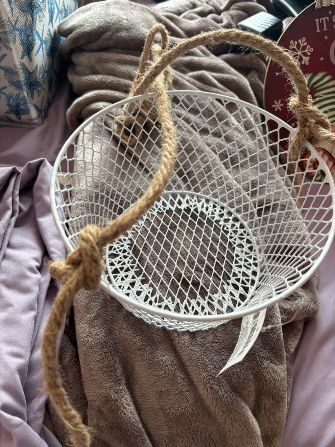 70I'm selling a cute hanging basket! It features a white wire basket with a sturdy rope handle. It would be perfect for plants or organizing small items around the house. It's in great condition and ready for a new home!