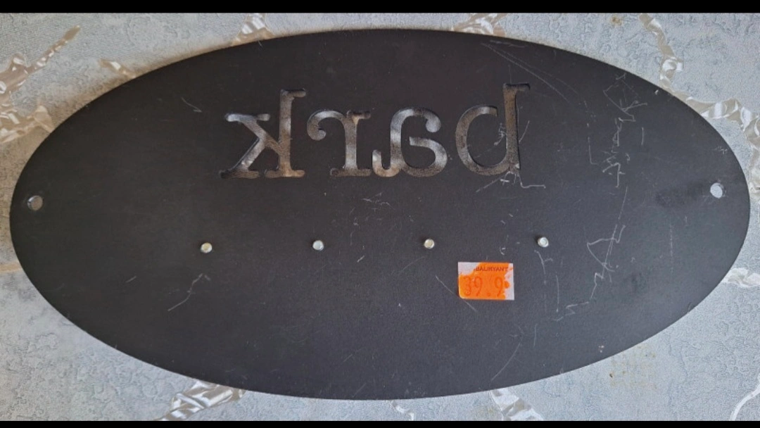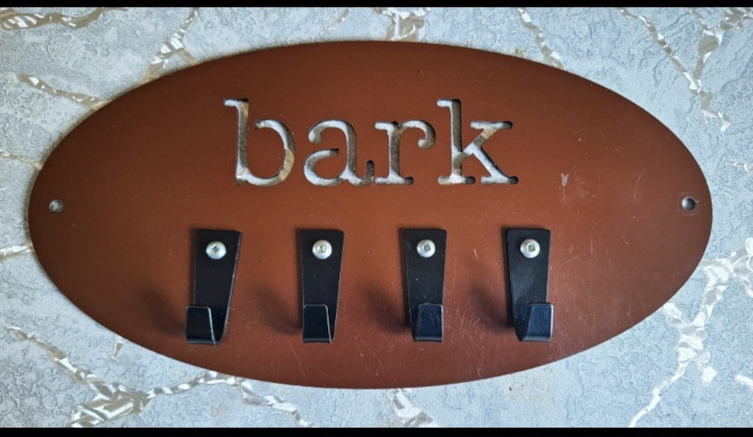 Hanging Metal Wall Mount Dog Leash Holder with the word "Bark" Cut Out to expose the wall color it's mounted to. Has 4 hooks to use. Comes from smoke free home. Retail $39.99 asking $15.00