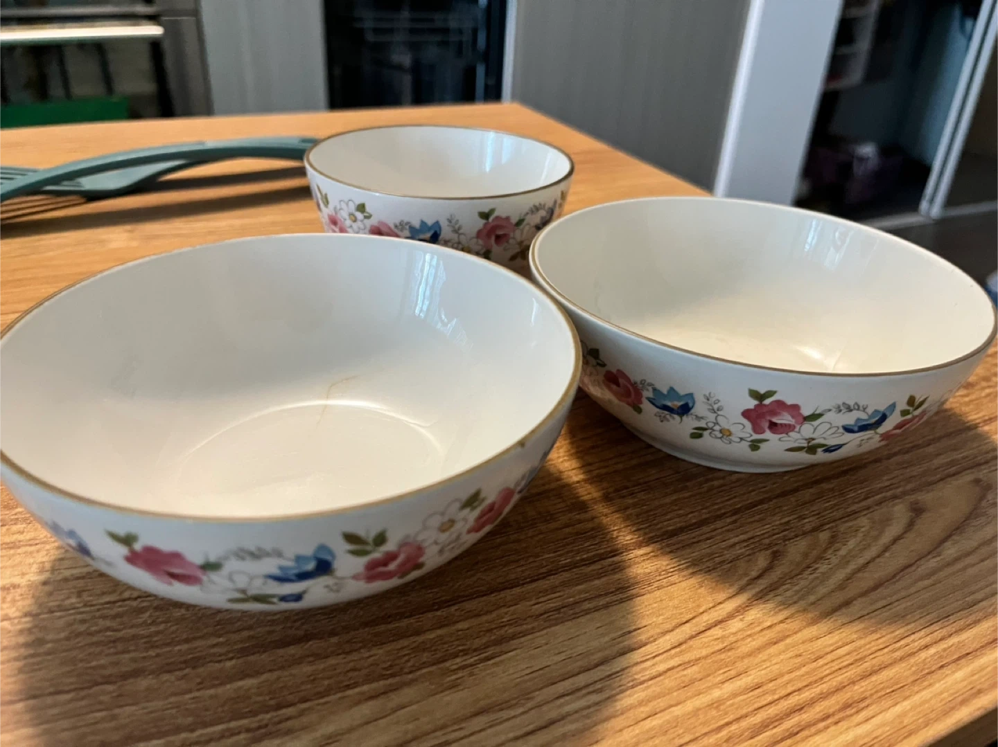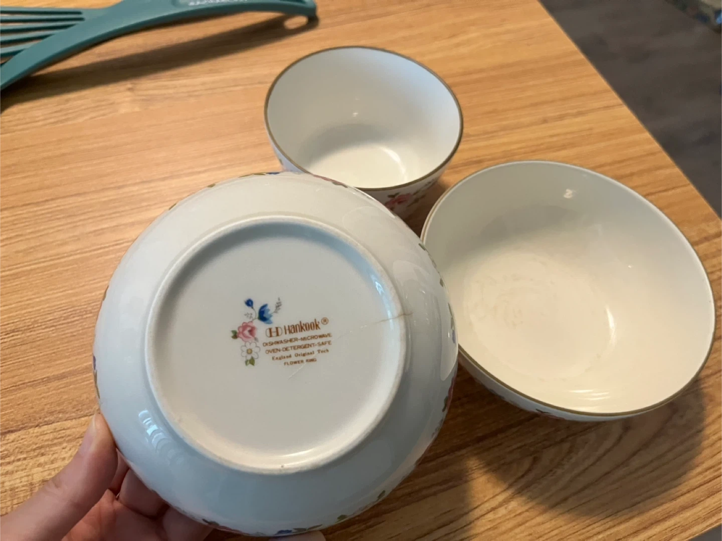 Selling a set of three Hankook bowls with the Original Tuck Flower design! They are dishwasher and microwave safe. Perfect for everyday use or to add a touch of vintage charm to your kitchen ********Moving-out Sale****** Pick-up is available only between Oct 26 and Oct 27 2 soup bowls and one rice bowl They are old but still good to go It's free if you buy any of my other items over $10.