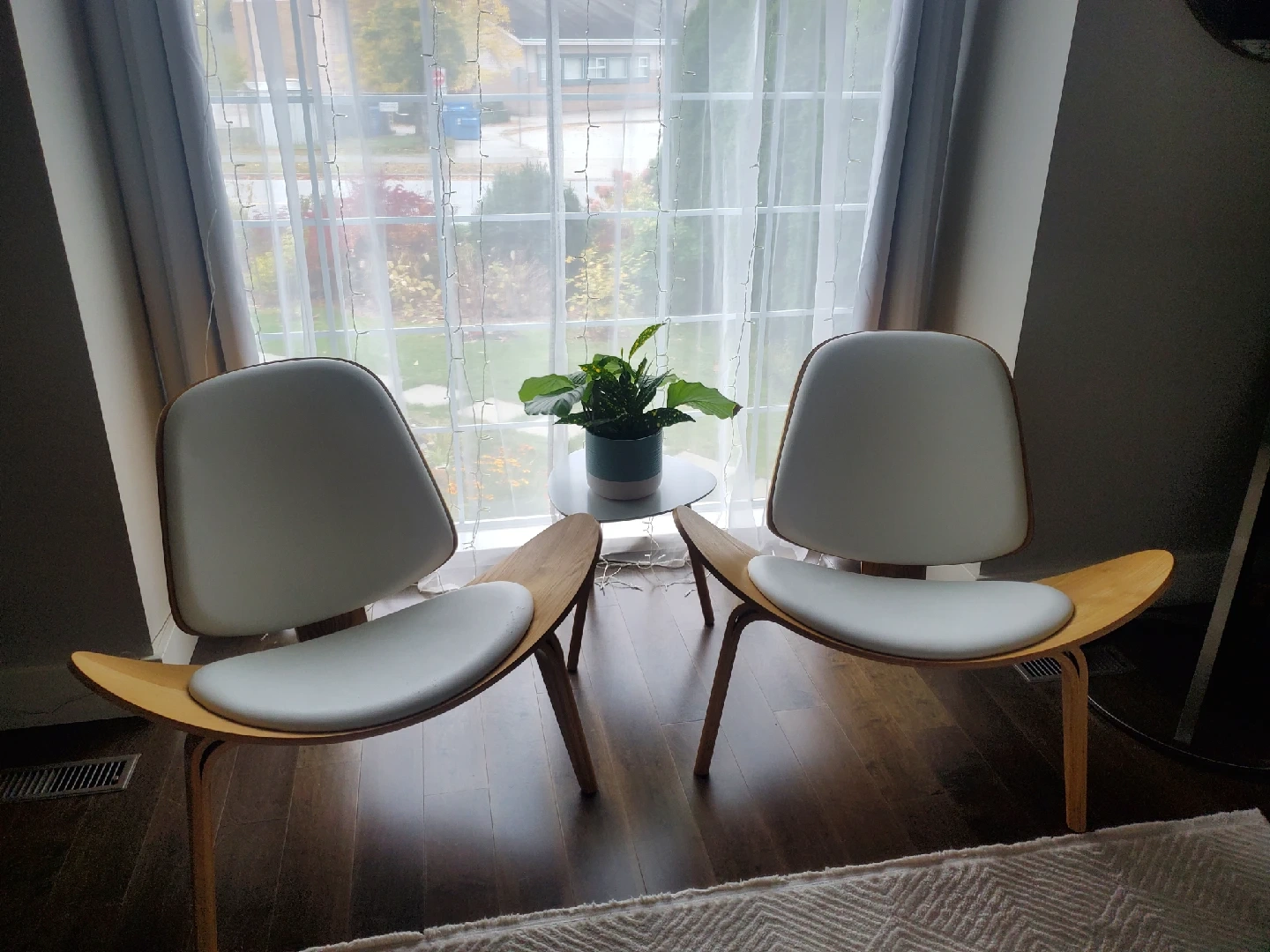 60Hans Wegner Style Three- Legged Shell Chair Ash Plywood White Faux Leather Accent Chair Living Room Furniture Mid-Century Modern Shell Chair (Wood Color-White)