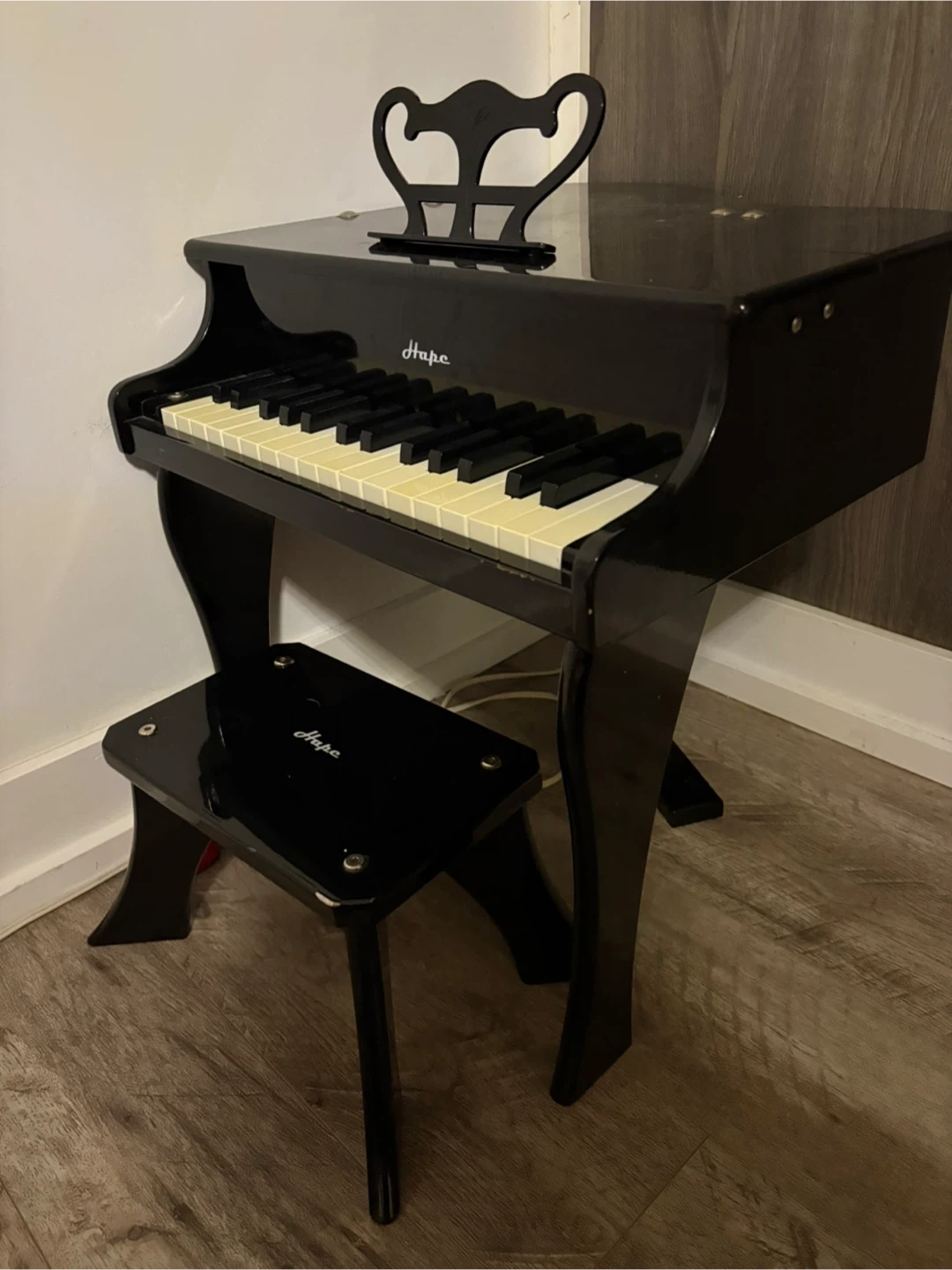 83Selling a Hape toy piano in black, complete with a matching stool! It's in great condition and perfect for introducing your little one to the world of music. The piano is designed to be child-safe and durable, ensuring hours of fun and creative play. It's a wonderful way to encourage musical development and imagination