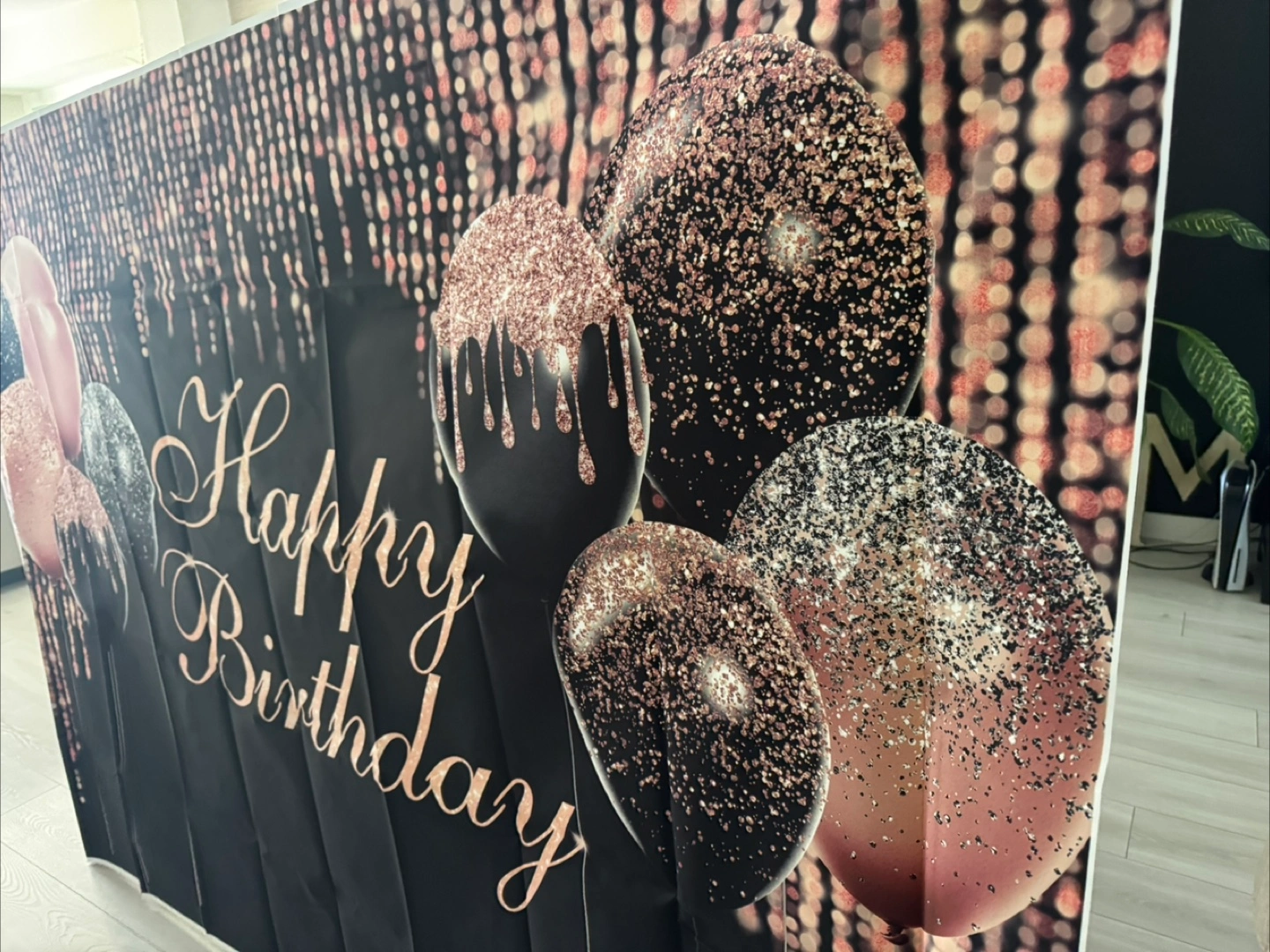 A Happy Birthday backdrop featuring balloons and a glittery design never used