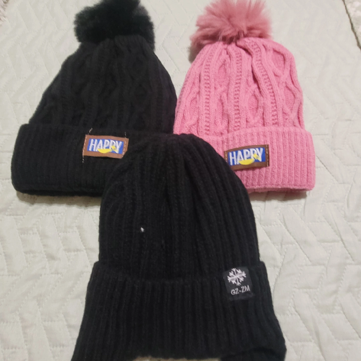 cozy winter beanies! There's one in black with a 'Happy' patch and another in pink, also with a 'Happy' patch. There's also a black beanie with a 'GZ-ZM' logo. Perfect for keeping warm during the cold months! CHOSE of 1 free