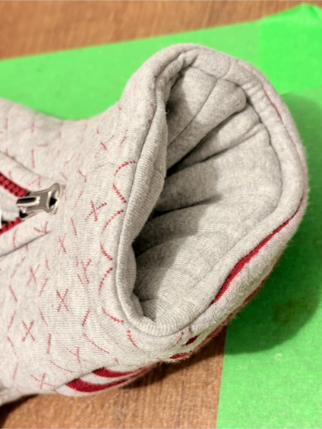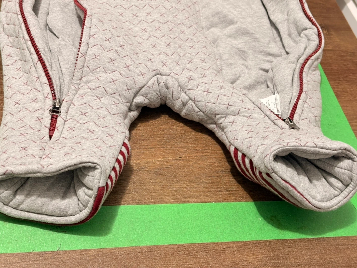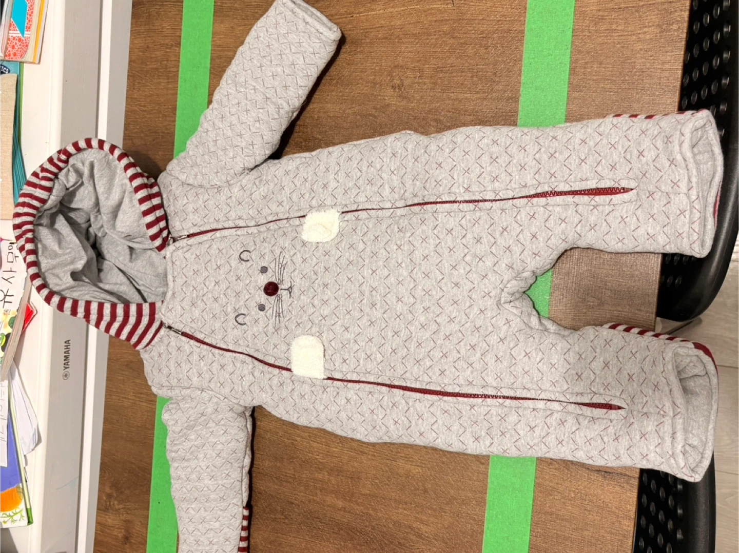 60Super cute Happyland baby snowsuit! Korean brand. 12-18M, a cozy hood with red and white stripes. The snowsuit is grey with a subtle cross pattern and red zipper details. Perfect for keeping your little one warm and snug during those chilly days!