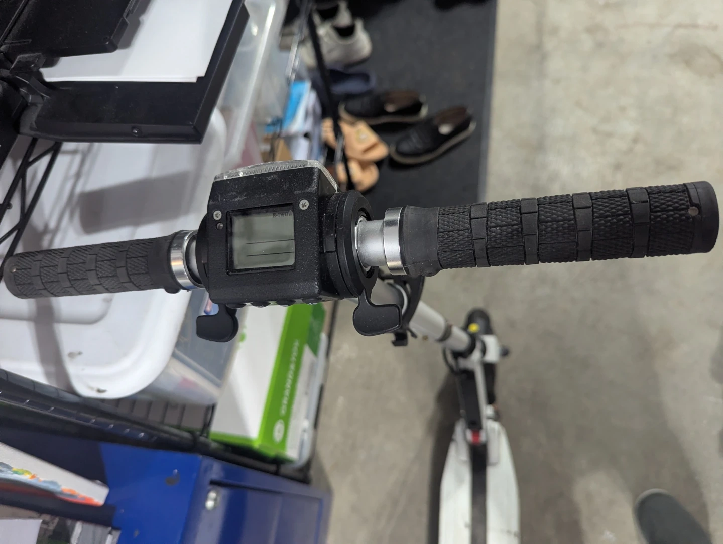 This is a white electric scooter with a digital display on the handlebars. It features a white deck with black grip tape accents and black handlebars. Suitable for urban commuting or recreational rides.