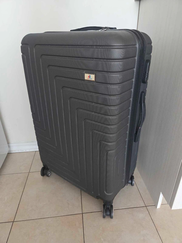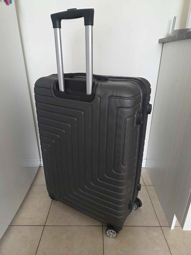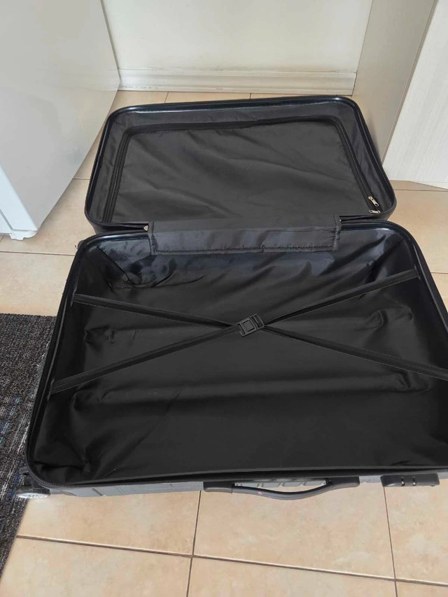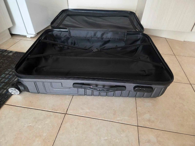 31This suitcase, with a hard shell and four wheels, is perfect for travel. It has a sleek design with a textured finish. The interior is spacious and includes straps to secure your belongings. Here are some additional details: * Hard shell for durability * Four smooth-rolling wheels * Telescoping handle * Spacious interior with securing straps Ready to roll into its next adventure, this suitcase is waiting for you! And yes, if you're seeing this listing, it's still available!