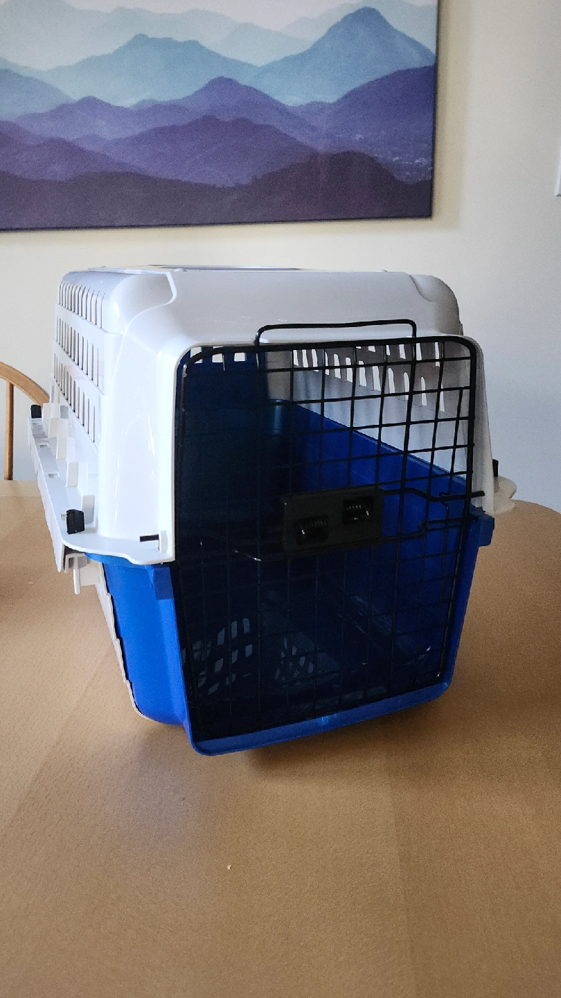49Selling a hard-sided pull-out pet carrier in blue and white! It's in great condition and ready for your furry friend's next adventure. 14"W x 20"L x ~13"H