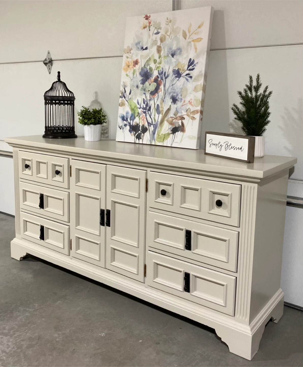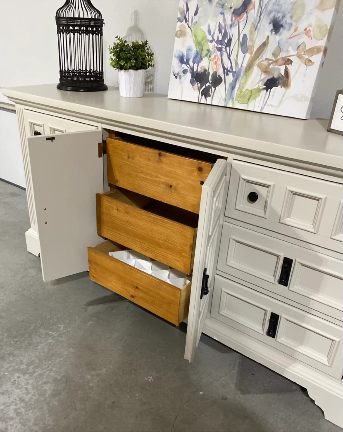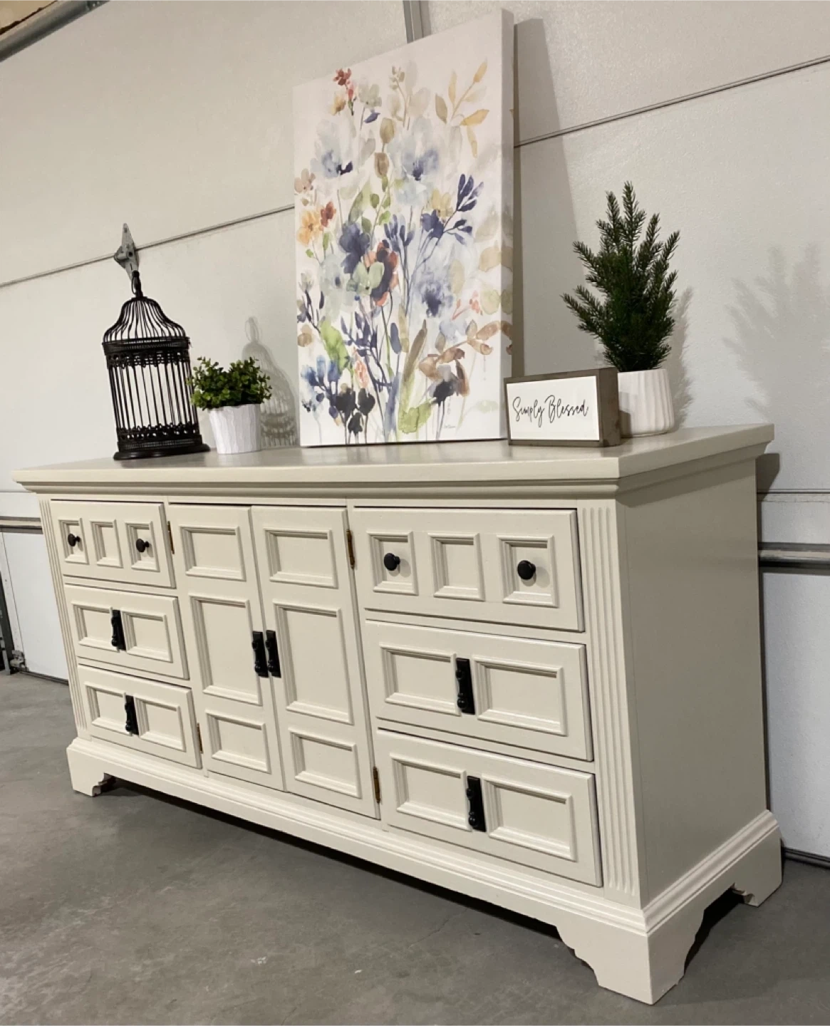 41Fabulous long hardwood Stanley Furniture dresser featuring 9 full sized dovetailed drawers Three slide out natural wood drawers behind the centre doors and six additional drawers Lovely square inserts with detailed side columns and decorative feet Painted in Chateau a warm off white with satin top coatings Black metal pulls and drop handles Measures: 72” W x 19” D x 34.5” H Price $399 Pickup in Airdrie or delivery available