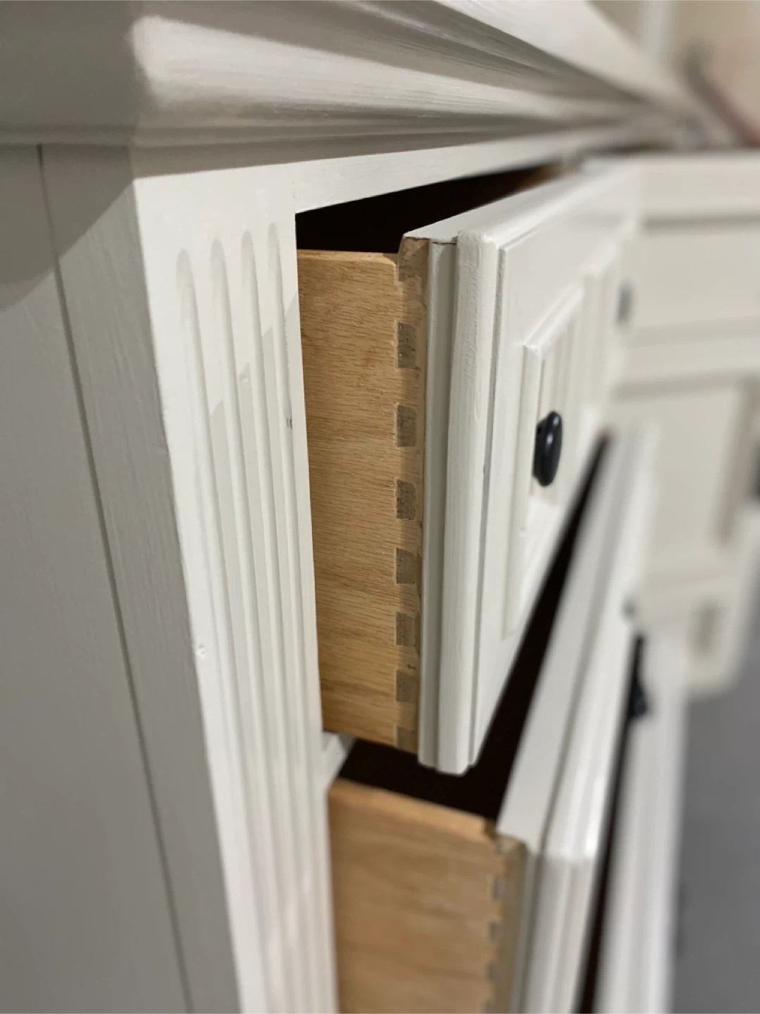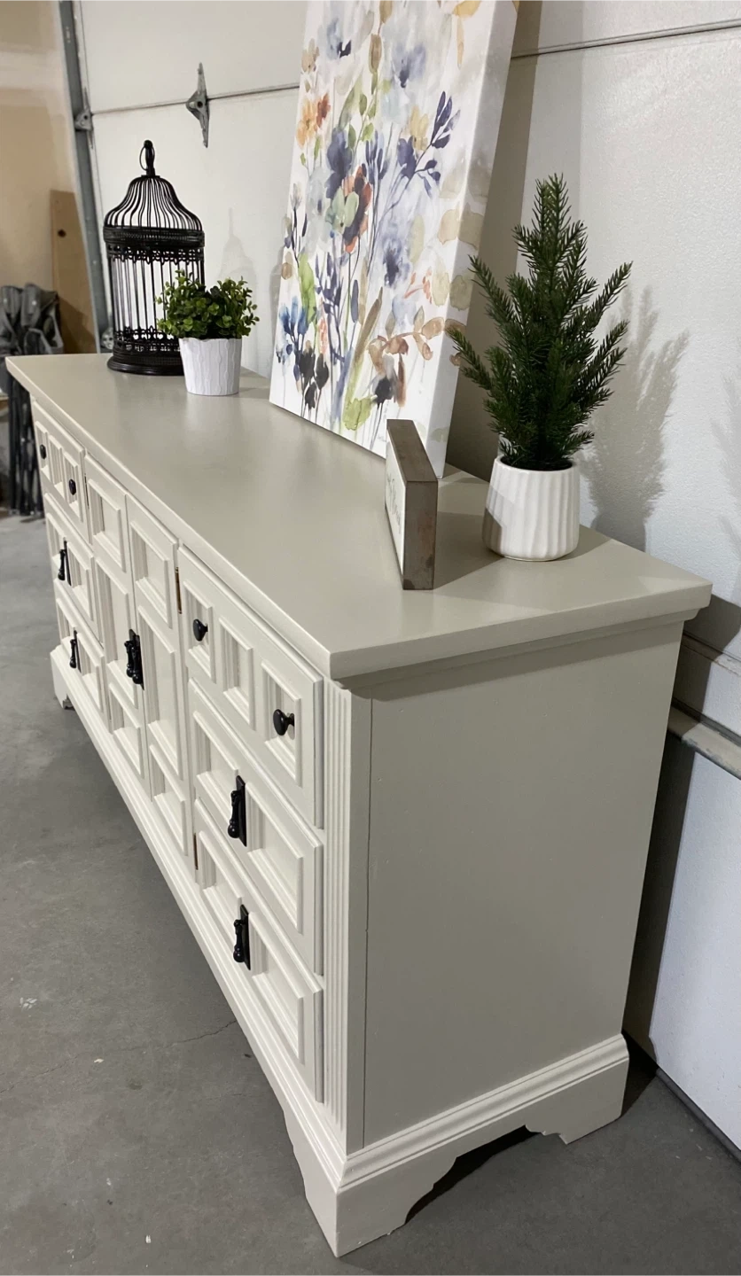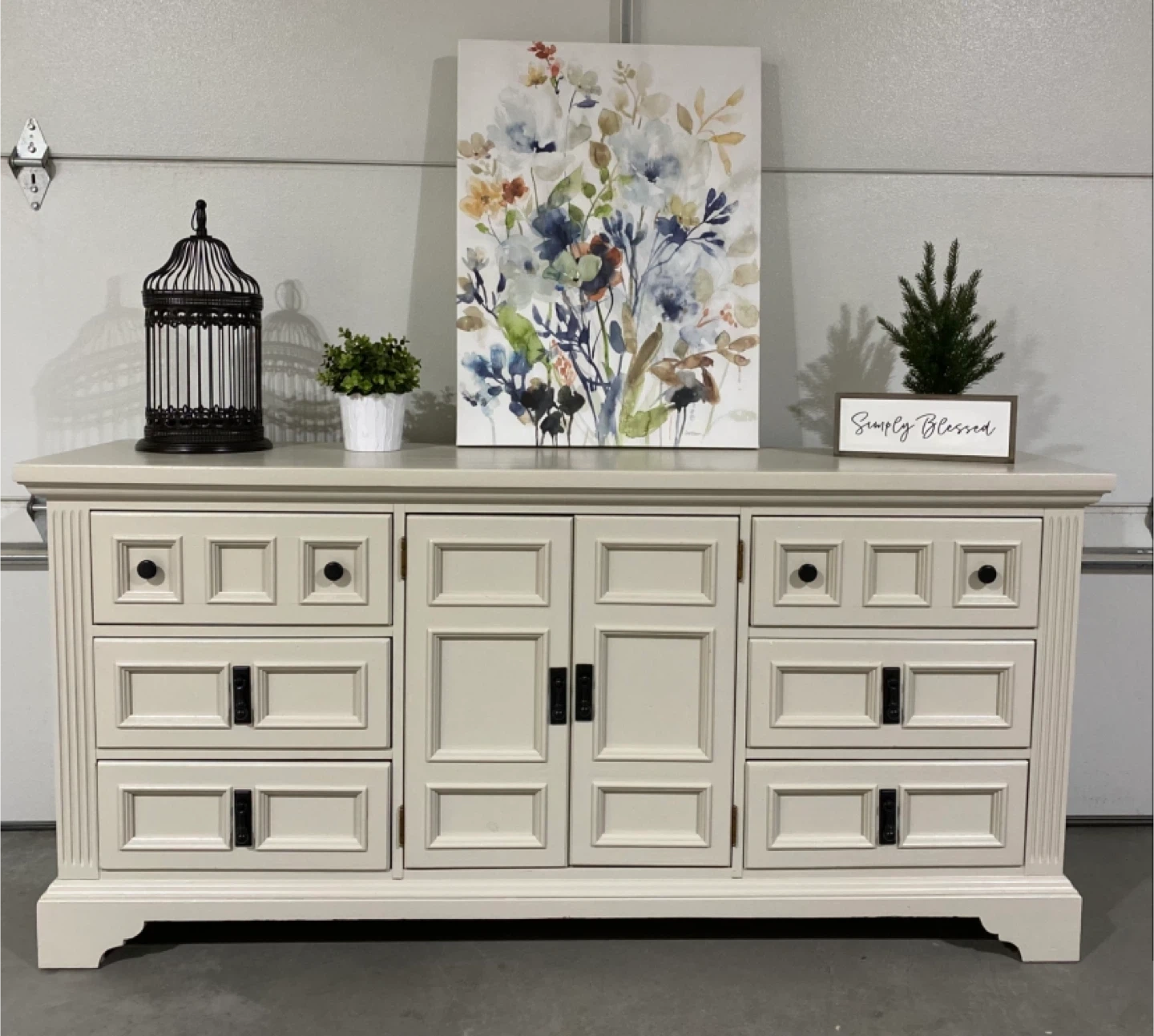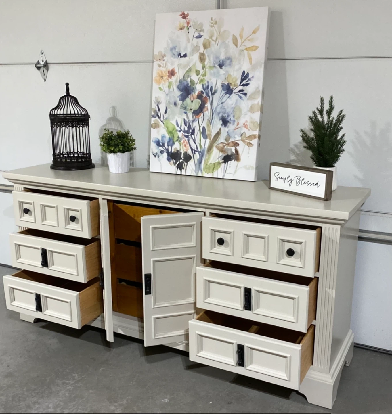 41Fabulous long hardwood Stanley Furniture dresser featuring 9 full sized dovetailed drawers Three slide out natural wood drawers behind the centre doors and six additional drawers Lovely square inserts with detailed side columns and decorative feet Painted in Chateau a warm off white with satin top coatings Black metal pulls and drop handles Measures: 72” W x 19” D x 34.5” H Price $399 Pickup in Airdrie or delivery available