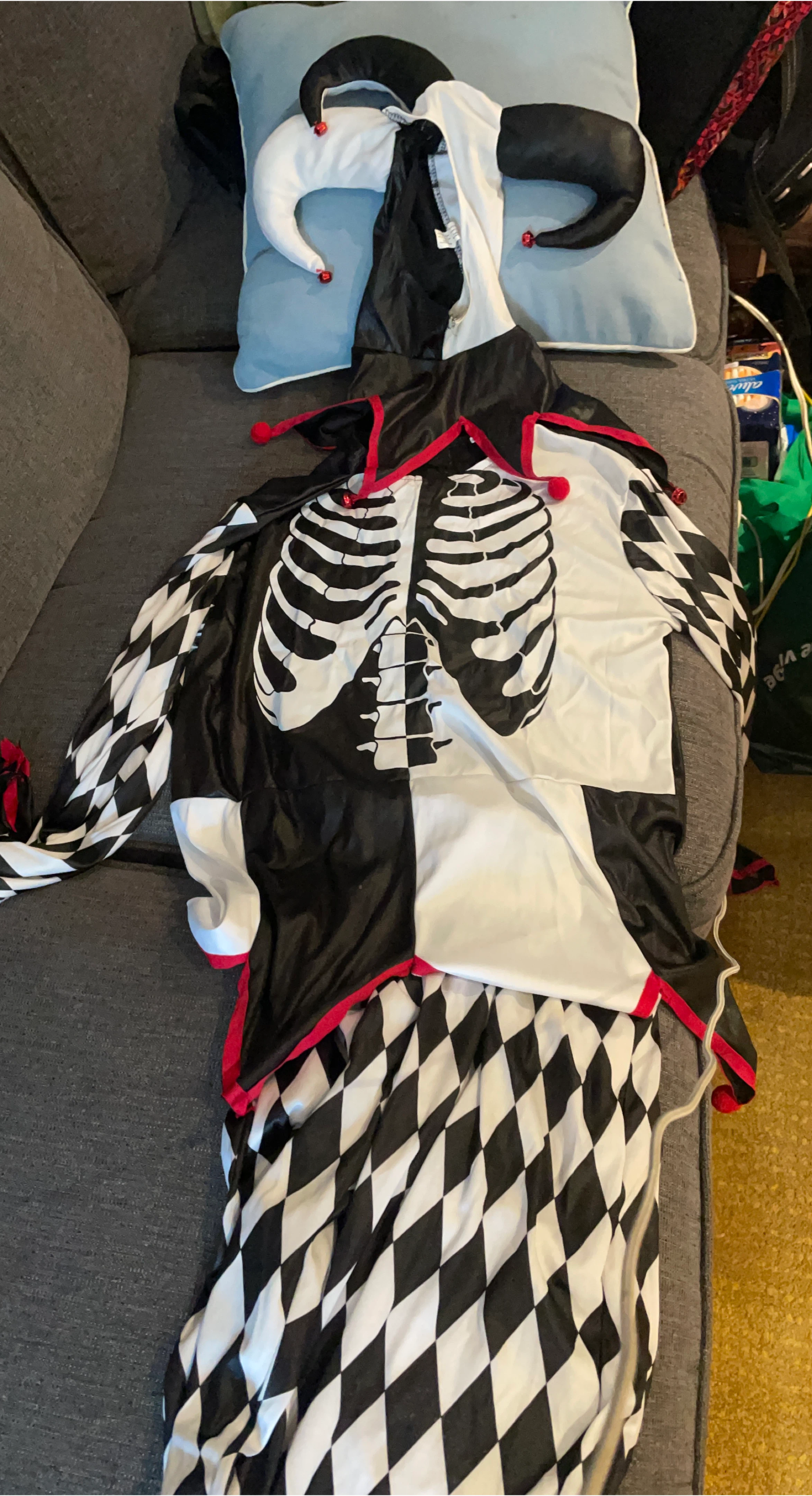 20Selling a harlequin jester costume! It features a black and white diamond pattern, a skeleton print on the front, and a hood with horns and bells. Great for Halloween or costume parties!