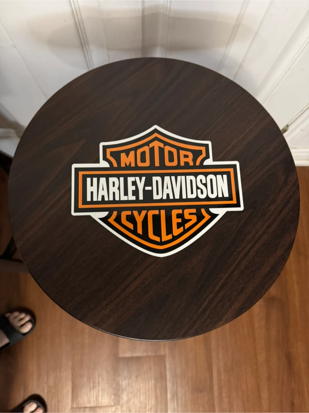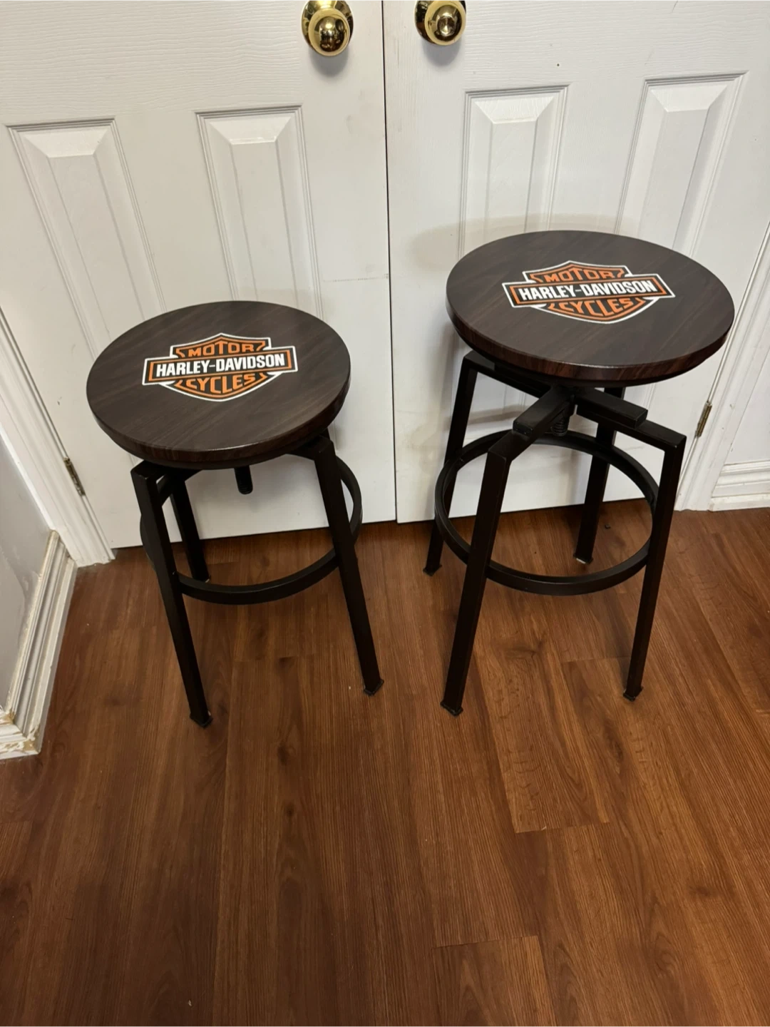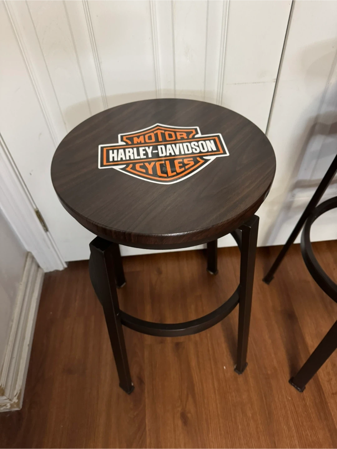 Selling twp Harley-Davidson bar stools. It's in great shape and would look awesome in any garage or bar area. The stool has a dark wood top with the Harley-Davidson logo on it and a black metal base. It's a cool piece for any Harley enthusiast! $ 70 each