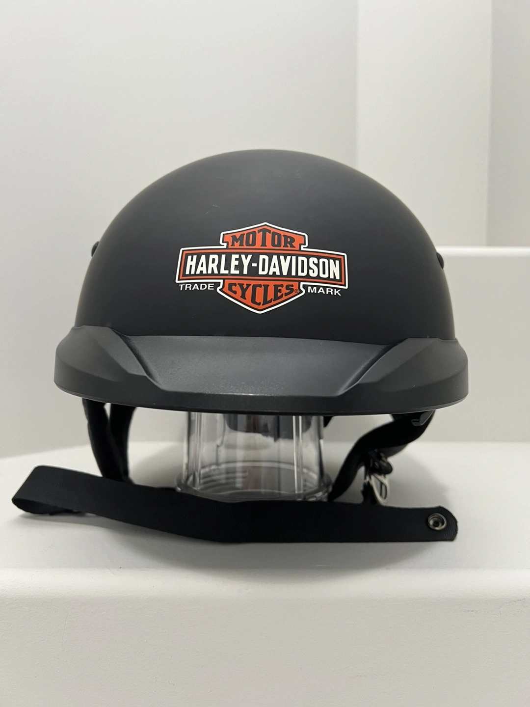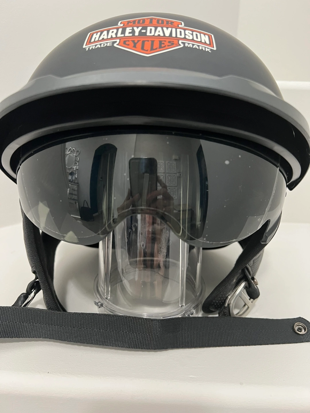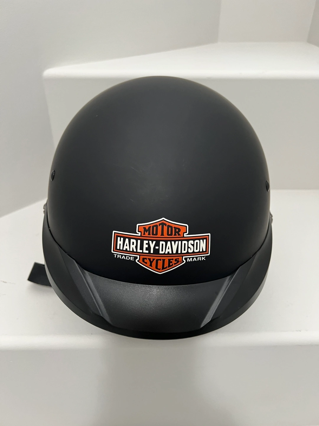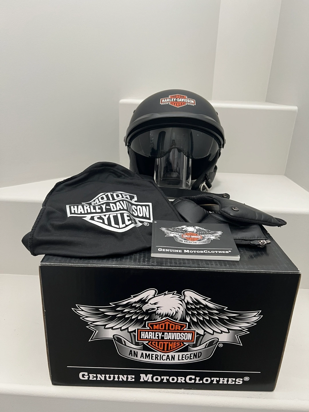 39NEW, unused genuine Harley-Davidson helmet set. Includes helmet in matte black colour, with pull-down visor (protective cover still on), extra padding, helmet bag, booklet and box. Size 2X-Large. Estate sale. Retail price: $217. Asking $100