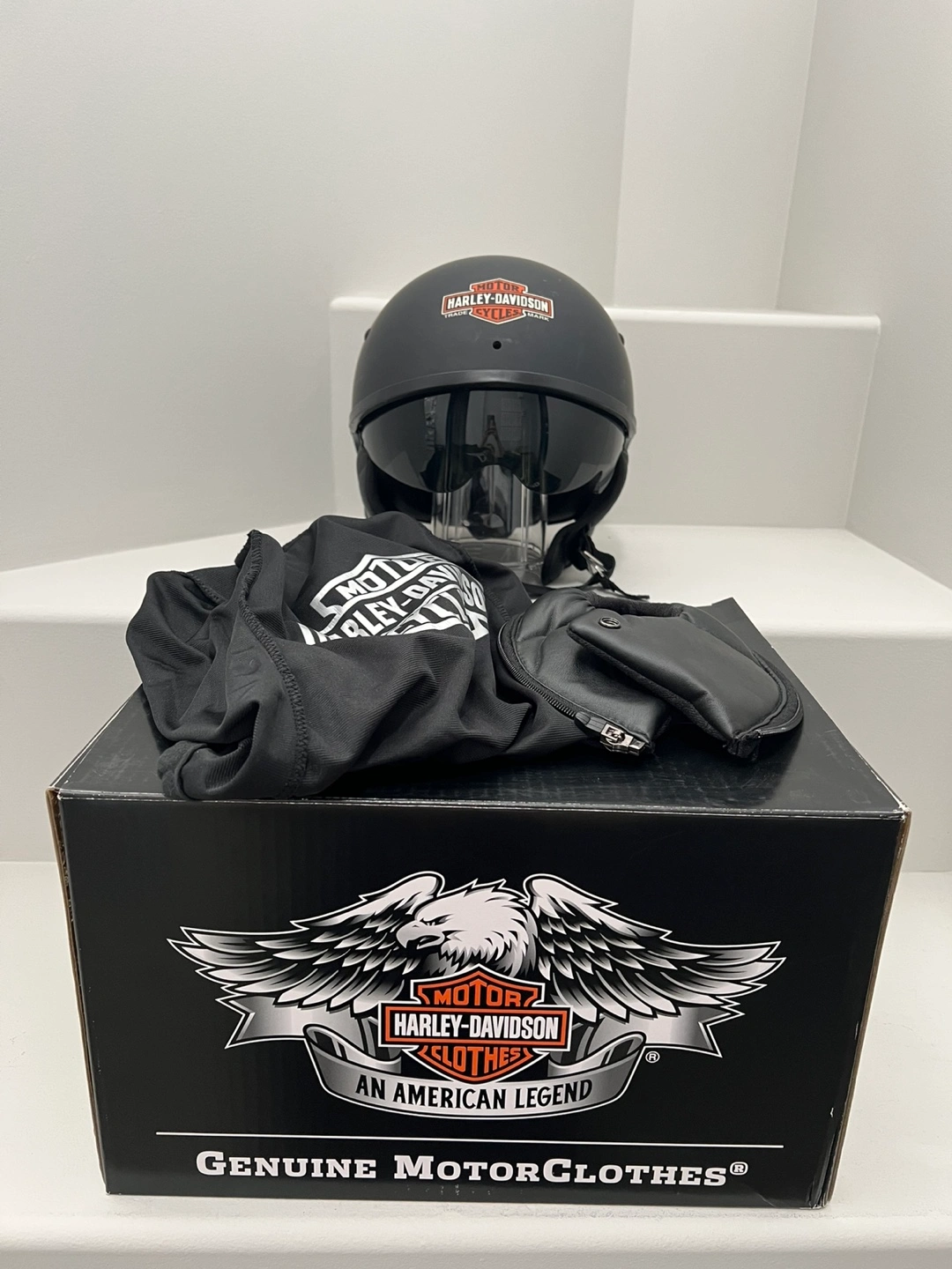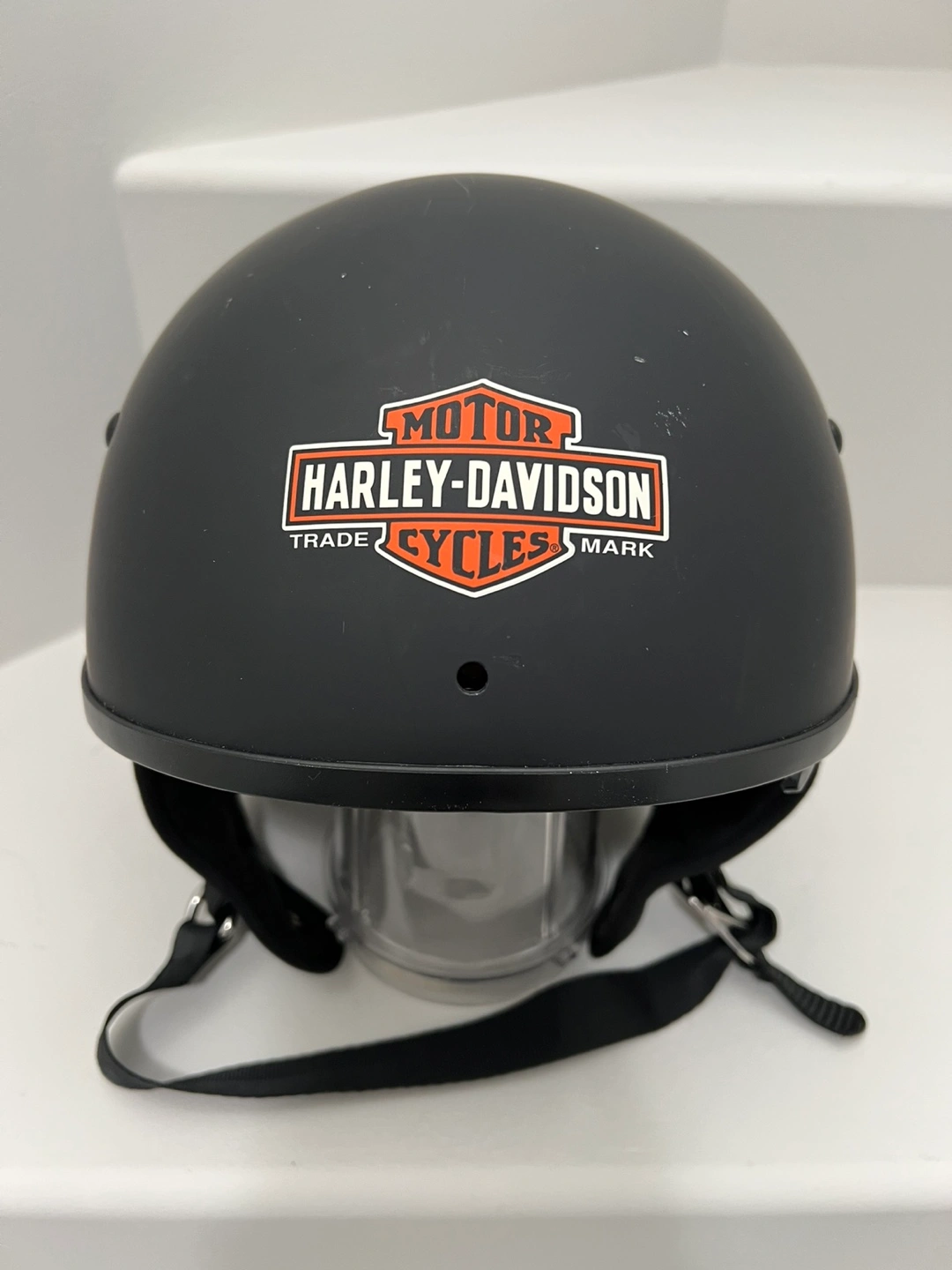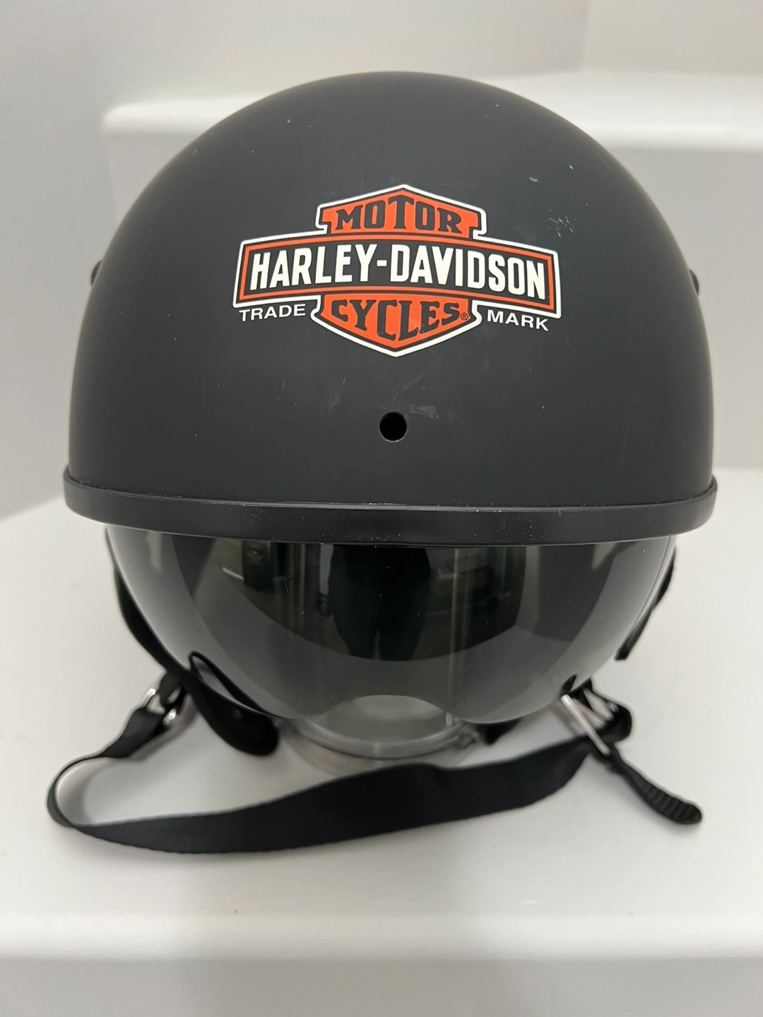 39Genuine Harley-Davidson helmet set. Includes helmet in matte black colour with pull-down visor, extra padding, helmet bag and box. Size Medium. Estate sale. Retail price: $217. Asking $60