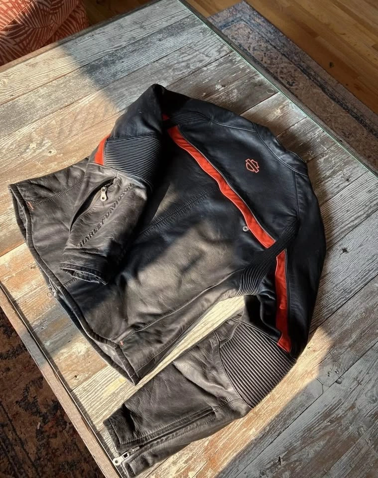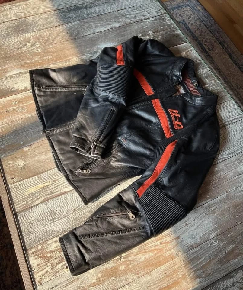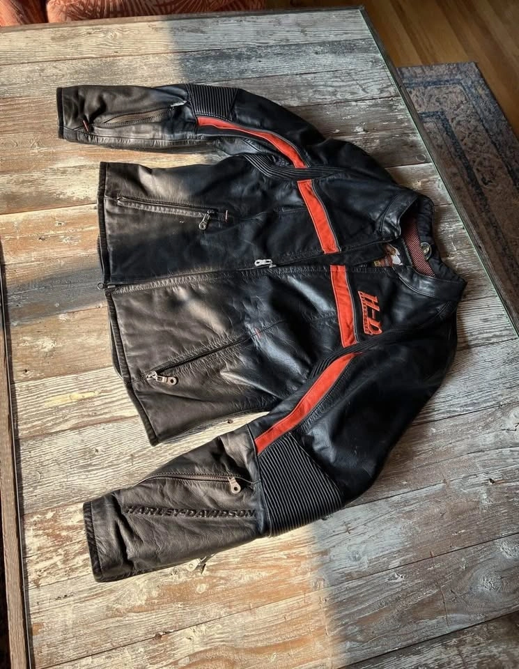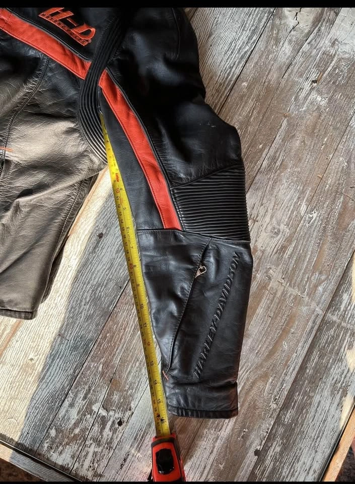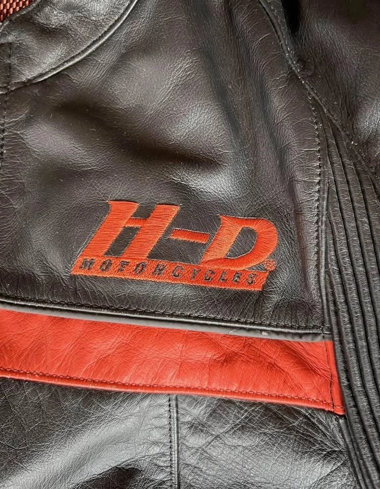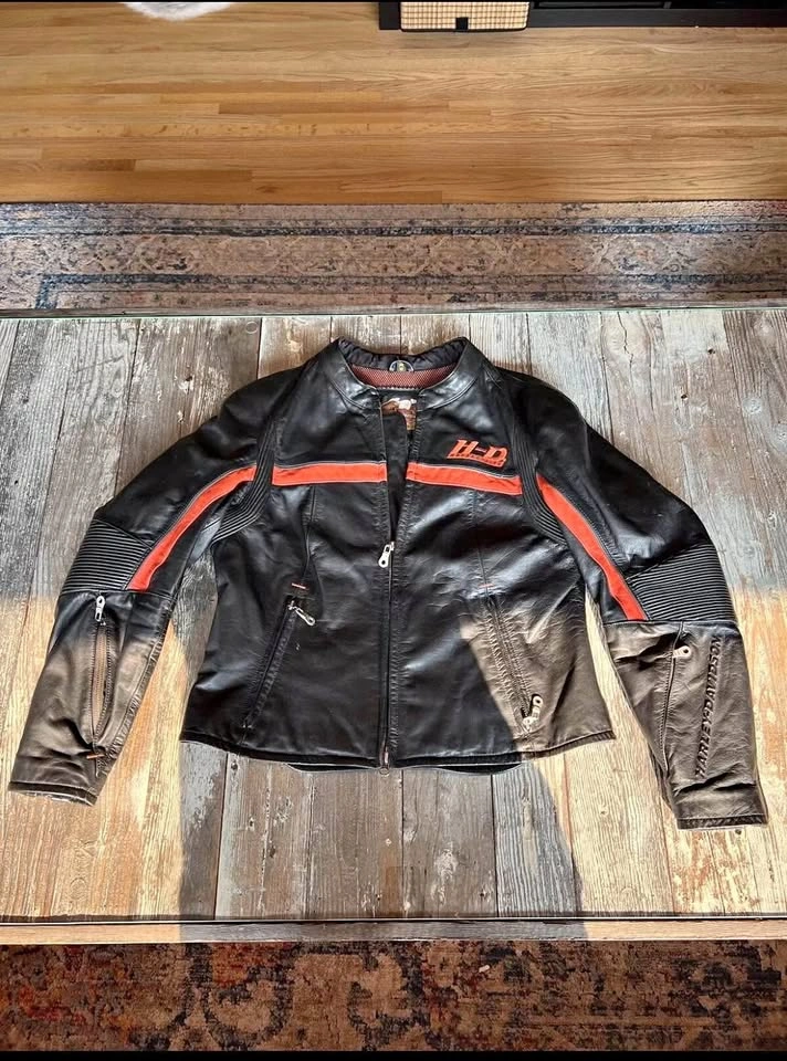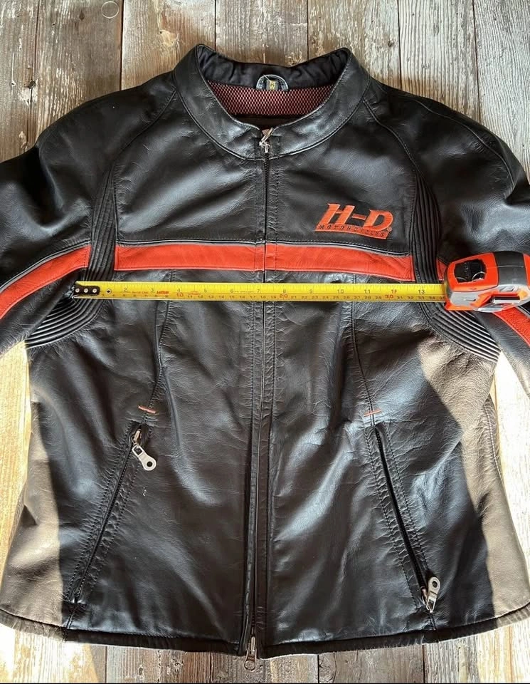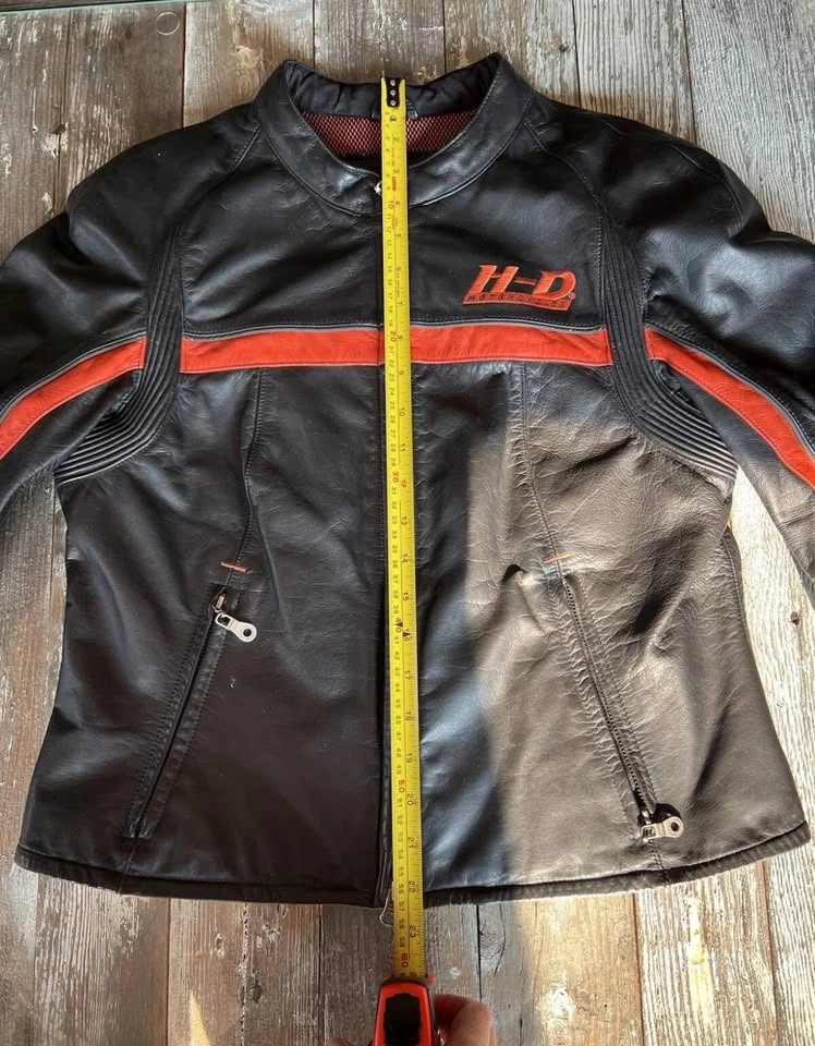 Harley-Davidson women's jacket in orange and black. Made from high-quality leather with an embroidered logo. Short length, long sleeves, with a zip closure. Designed for all seasons, with a breathable softshell fabric type and a polyester lining. It also features vents, a collarless design, built-in lumbar back support, and a zip-out liner. Size WM. Excellent Condition, everything works, no damage at all. Pick up near Southcentre mall - if this ad is up, it is available.