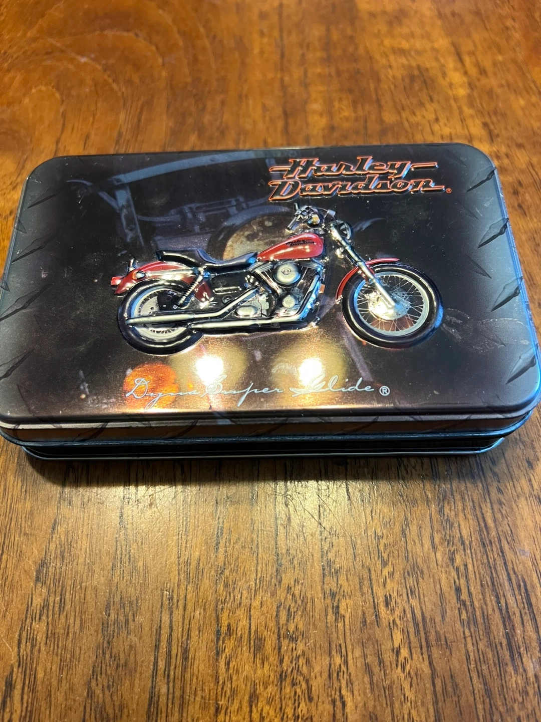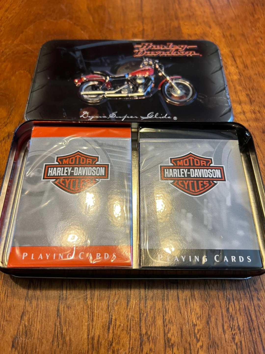 35A set of playing cards. Cards are in a metal case. The lid features a motorcycle. This set is a great way to unwind after a long day.