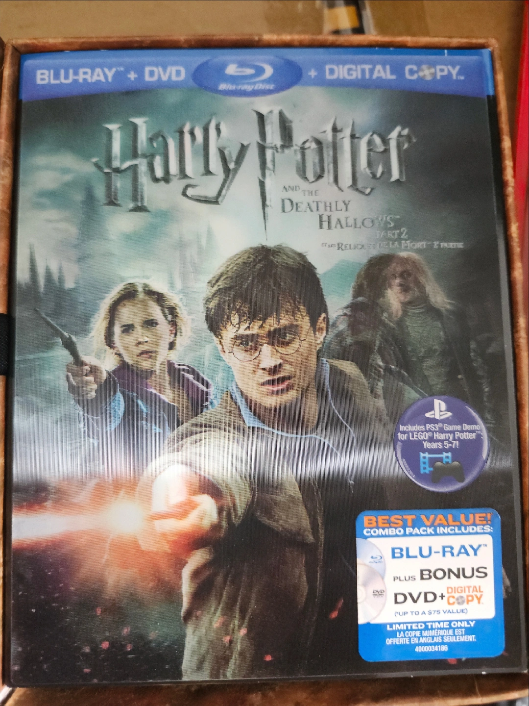 Selling a Blu-ray combo pack of Harry Potter and the Deathly Hallows! Includes Part 1 and Part 2. It also comes with a collectible Gringotts Bank Box! Mint condition and digital code (s) havent been used