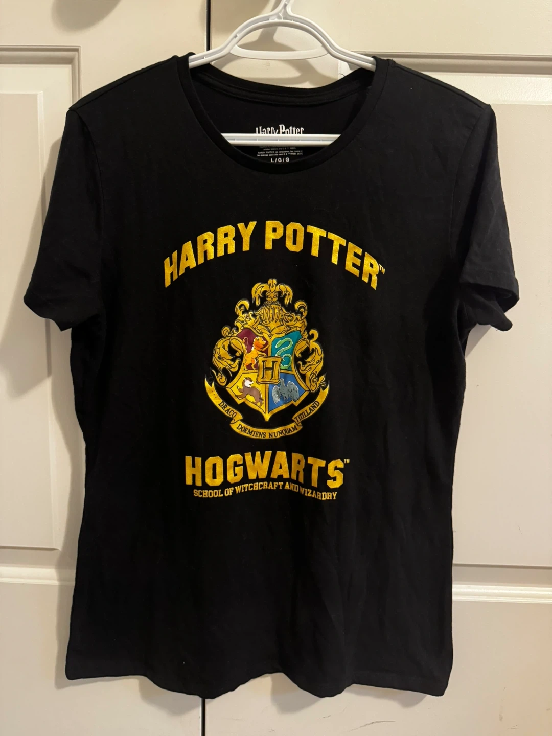 Selling a Harry Potter t-shirt in black! It features the Hogwarts crest and says "Hogwarts School of Witchcraft and Wizardry". The size is L/G/G.