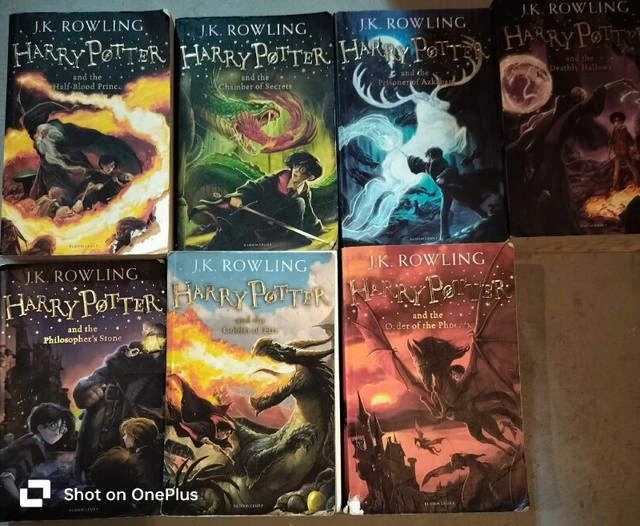 Dive into the wizarding world with this complete set of J.K. Rowling's Harry Potter series! The books included are Harry Potter and the Sorcerer's Stone, Harry Potter and the Chamber of Secrets, Harry Potter and the Prisoner of Azkaban, Harry Potter and the Goblet of Fire, Harry Potter and the Order of the Phoenix, Harry Potter and the Half-Blood Prince and Harry Potter and the Deathly Hallows. This collection is perfect for any Harry Potter enthusiast looking to relive the magic or introduce it to a new generation. These books have been well-loved and show some signs of use, which only adds character to this enchanting series. Owning these books is like having your own personal portkey to Hogwarts.