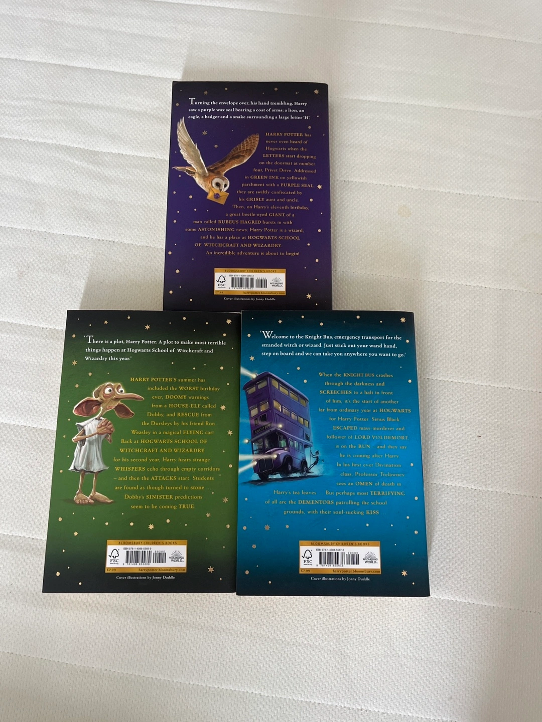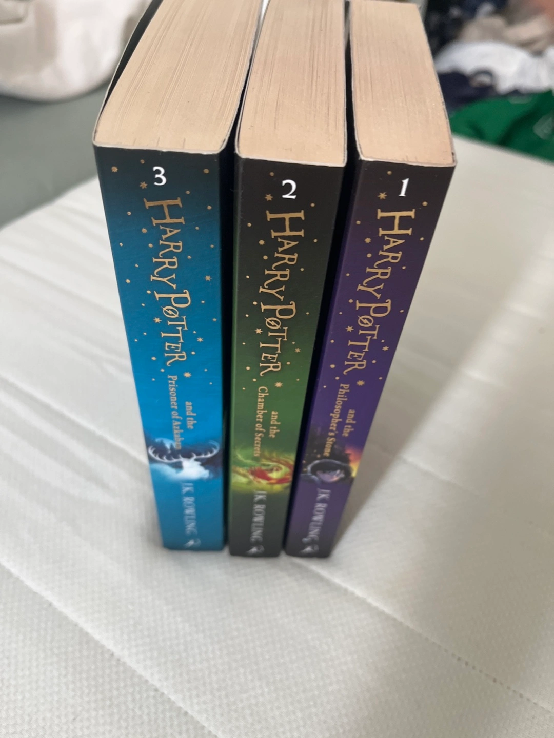 93Selling the first three Harry Potter books by J.K. Rowling: - Harry Potter and the Philosopher's Stone (Book 1) - Harry Potter and the Chamber of Secrets (Book 2) - Harry Potter and the Prisoner of Azkaban (Book 3) Great for any Harry Potter fan!