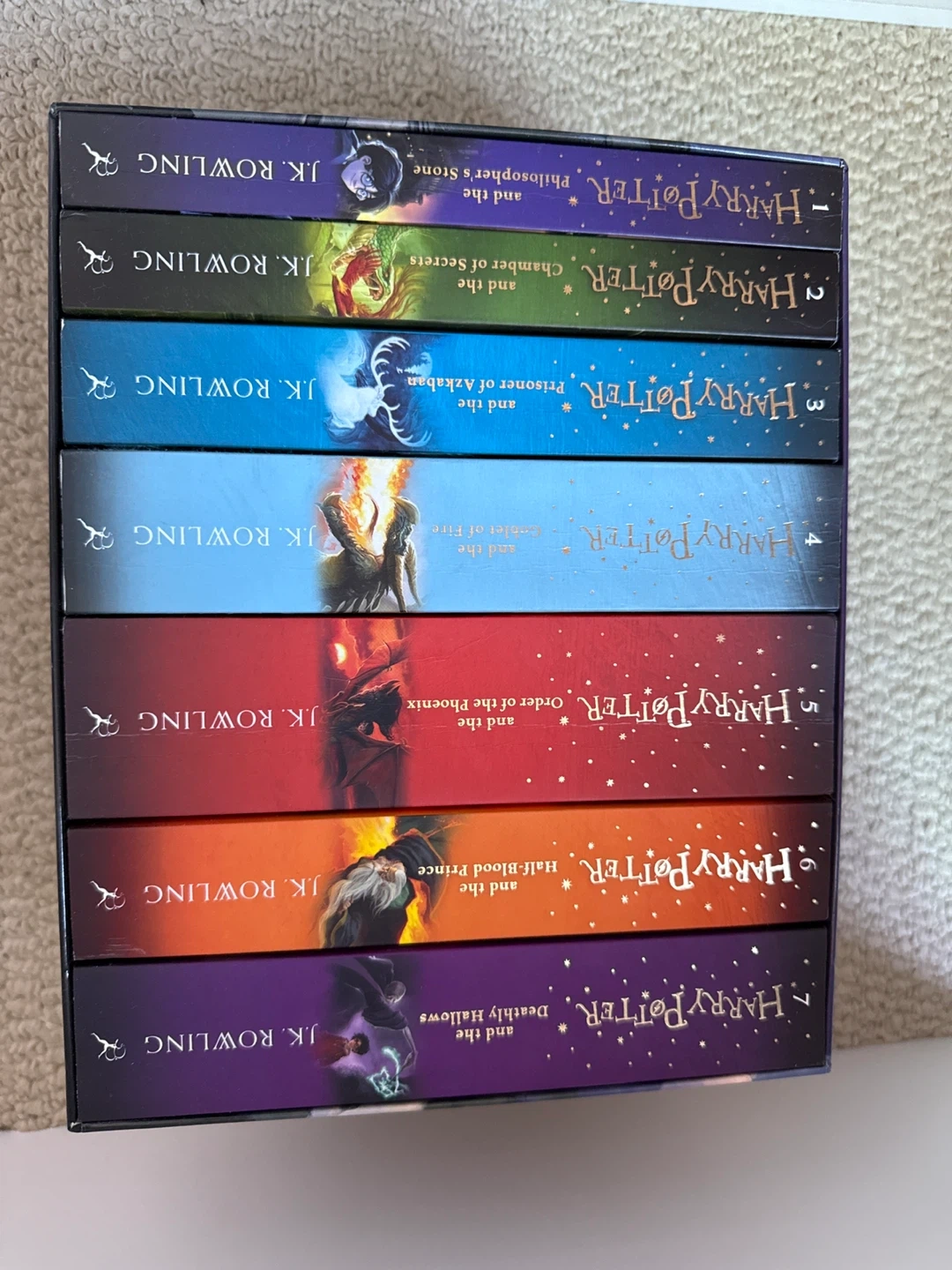 Selling the complete set of Harry Potter books 1 through 7 by J.K. Rowling. This collection includes: - Harry Potter and the Philosopher's Stone - Harry Potter and the Chamber of Secrets - Harry Potter and the Prisoner of Azkaban - Harry Potter and the Goblet of Fire - Harry Potter and the Order of the Phoenix - Harry Potter and the Half-Blood Prince - Harry Potter and the Deathly Hallows