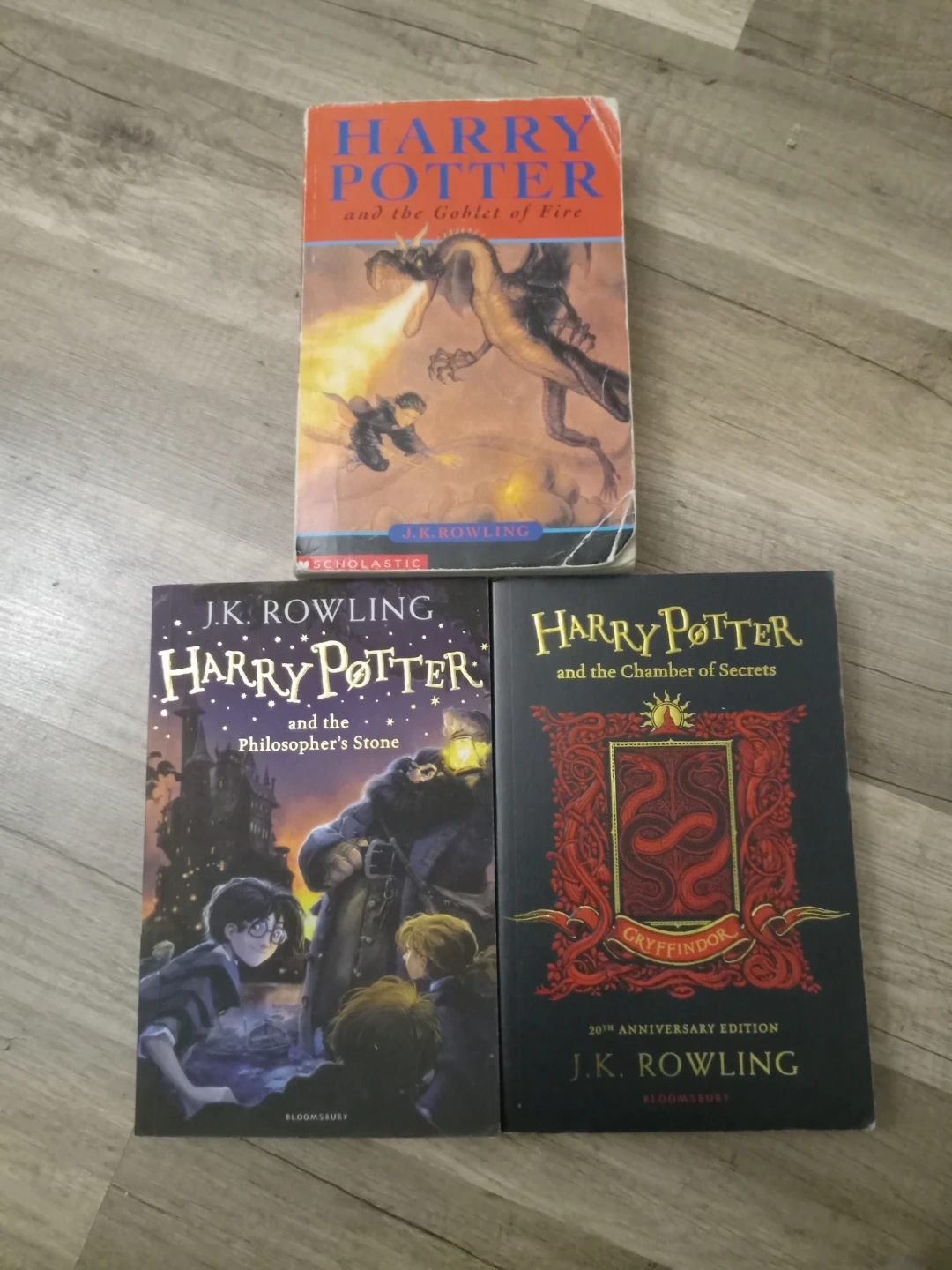 10Selling a set of three Harry Potter books by J.K. Rowling: - Harry Potter and the Goblet of Fire - Harry Potter and the Philosopher's Stone - Harry Potter and the Chamber of Secrets (20th Anniversary Edition) the book on the top is used the two lower books new condition, never read.