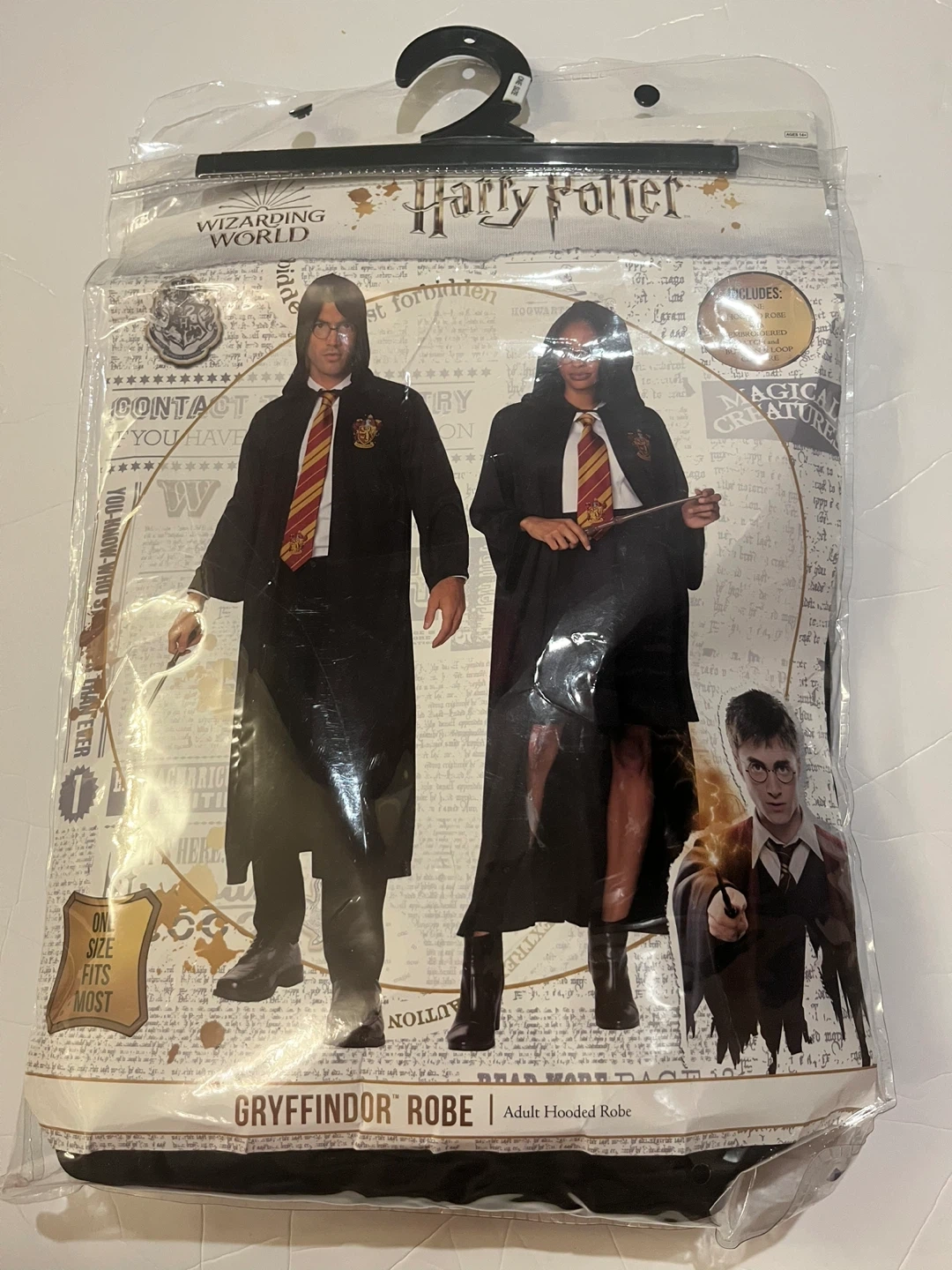 Selling a Harry Potter Gryffindor adult hooded robe. It's one size fits most and includes the robe itself Perfect for any Harry Potter fan
