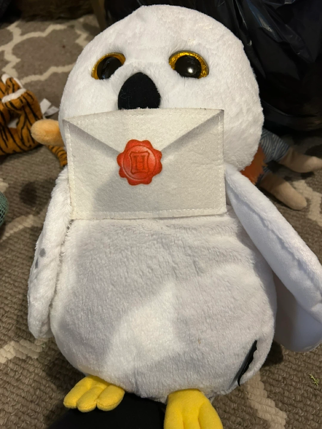 71Selling a cute Hedwig plush toy from Harry Potter! It's in great shape and features the iconic snowy owl holding a Hogwarts letter. Perfect for any Harry Potter fan!