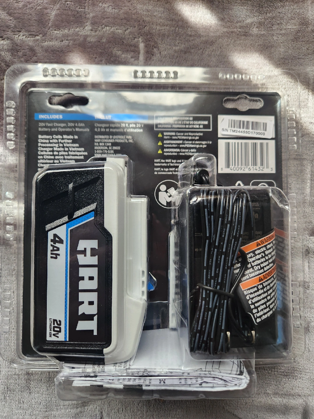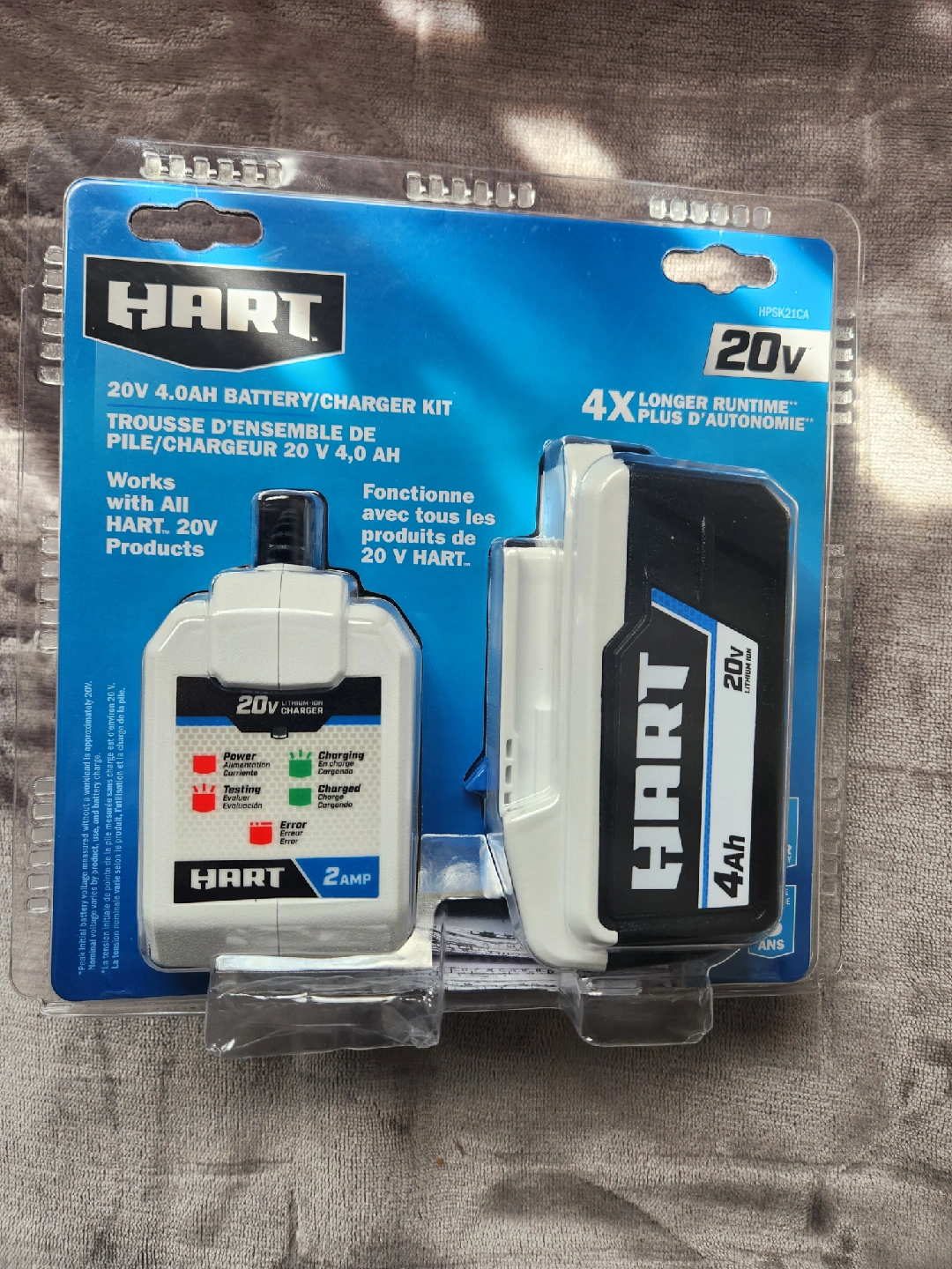 Brand new, Pick Up in Airdrie, No Delivery, Price is firm. Product details The HART 20V 4.0Ah Lithium-Ion battery is an excellent addition, or start to, any DIYer’s HART tool collection. This battery is compatible with all HART 20V power tools. It features Lithium-Ion technology to give you long-lasting and fade-free power to get you through any project you decide to take on. This battery is designed to be compact and lightweight for more maneuverability and while reducing user fatigue. Whether you are maintaining your yard with HART outdoor tools, cleaning and maintaining your car with HART automotive tools or keeping cool and entertaining with HART lifestyle tools, the HART 20V 4.0 Ah battery is there to provide the power you need when you need it with 4x longer runtime than the HART 20V 1.5 Ah Lithium-Ion battery. - The 20V one battery system allows you to interchange the battery on all 20V HART products. - It powers all HART 20V tools, outdoor, automotive and lifestyle items - 4X Longer Runtime* - On-Board Fuel Gauge - Battery chart that is on the back of packaging - Works with All HART 20V Tools - Fade free Lithium-Ion power - Fast 2 AMP charger - Compatible with all HART 20V batteries