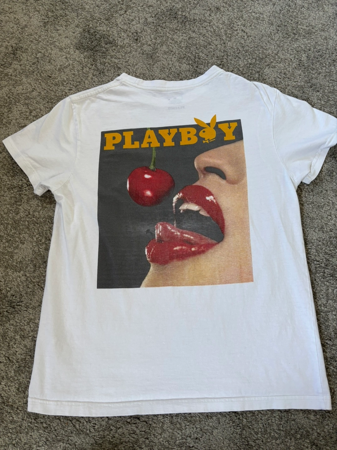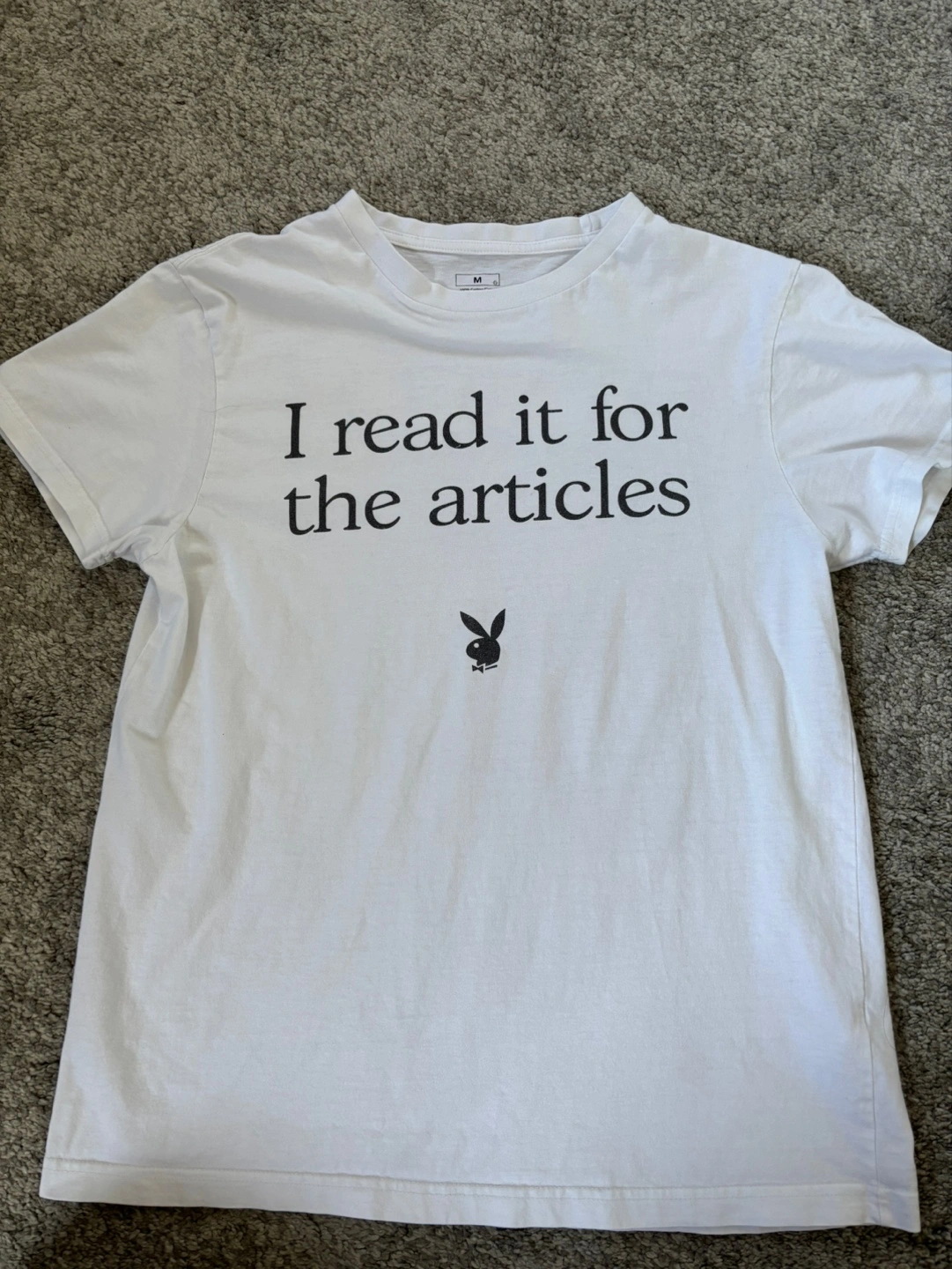 White cotton t-shirt. Front graphic: "I read it for the articles" with Playboy bunny logo. Back graphic: Playboy logo and vintage Playboy image. Size: M. Excellent condition.