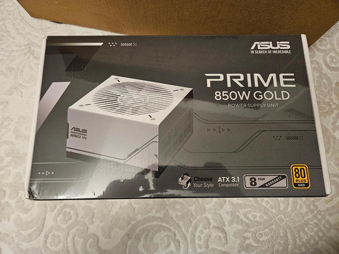 This is an ASUS PRIME 850W Gold power supply unit. It's ATX 3.0 compatible and comes with an 8-year warranty. It's 80 PLUS Gold certified for efficiency.