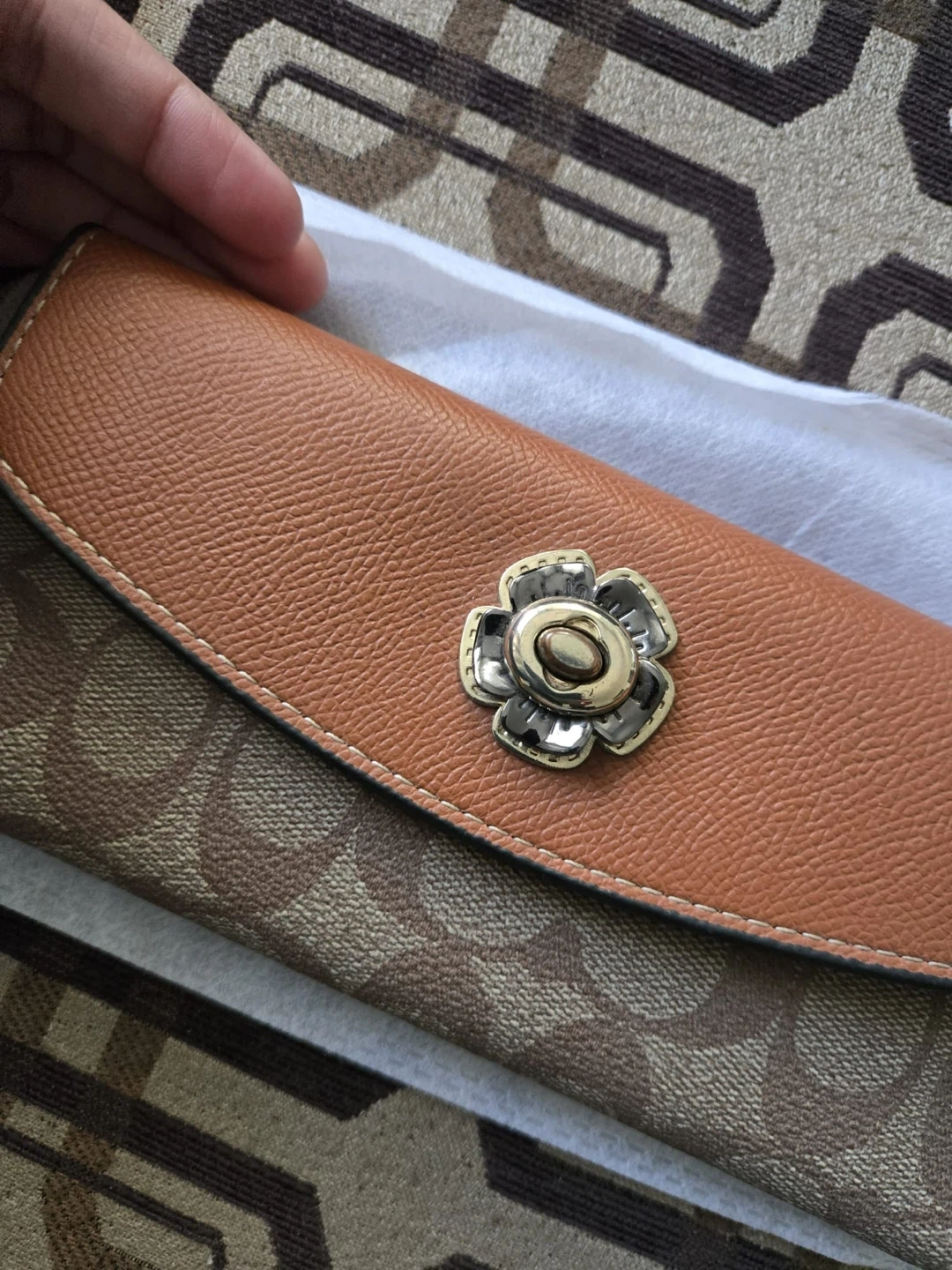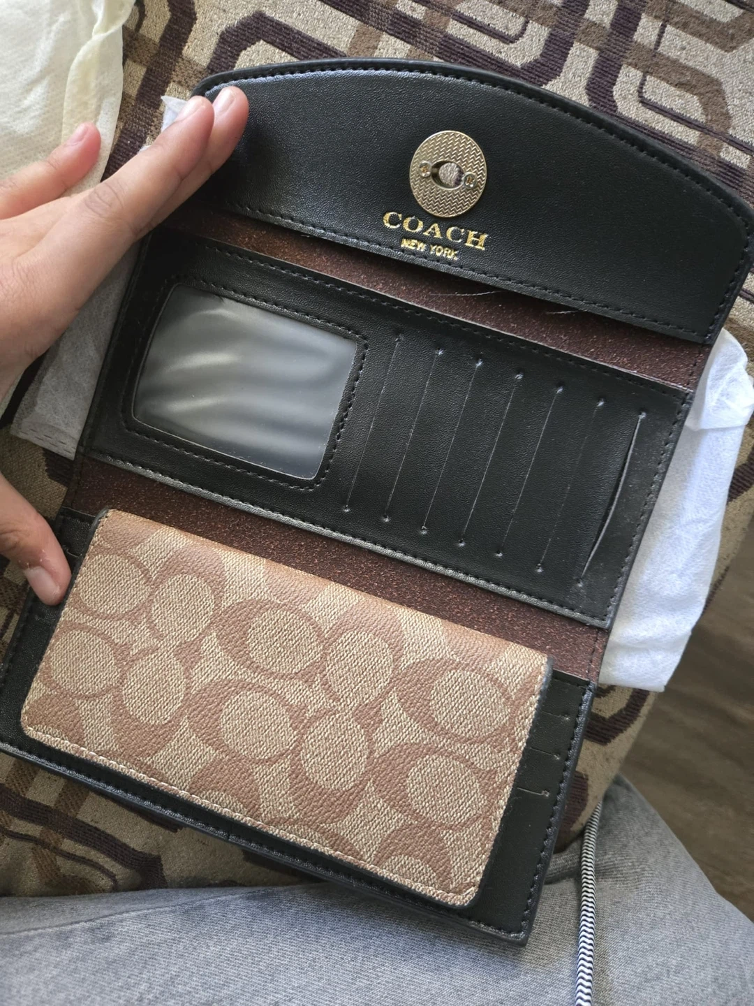 Classic Coach signature long wallet in tan and brown. with a gold-tone turnlock closure. Includes multiple card slots and a clear ID window. Comes in original dust bag. It’s vintage so it’s harder to find now!