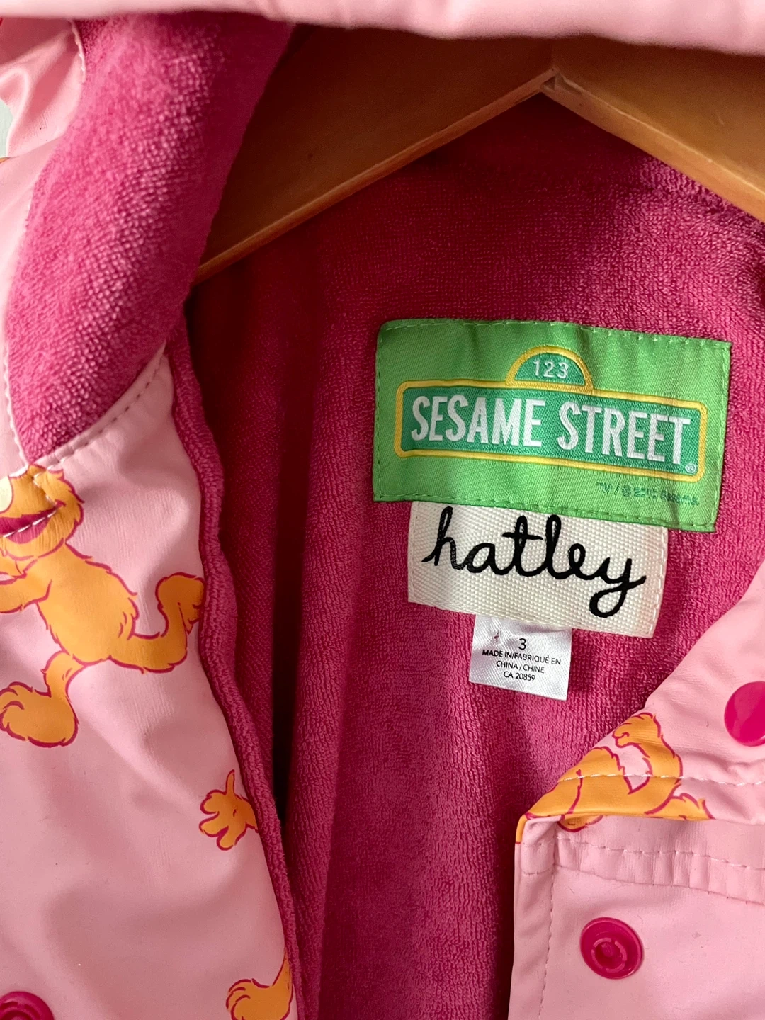 This adorable Hatley raincoat features a fun Sesame Street Elmo print! Size 3, with Lining, perfect for keeping your little one dry on rainy days. Comes with a matching umbrella.
