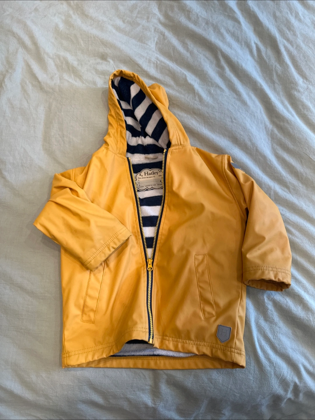 Here's a cute yellow raincoat from Hatley! It's in great condition and perfect for rainy days. The inside is lined with a navy and white striped pattern. Size 4