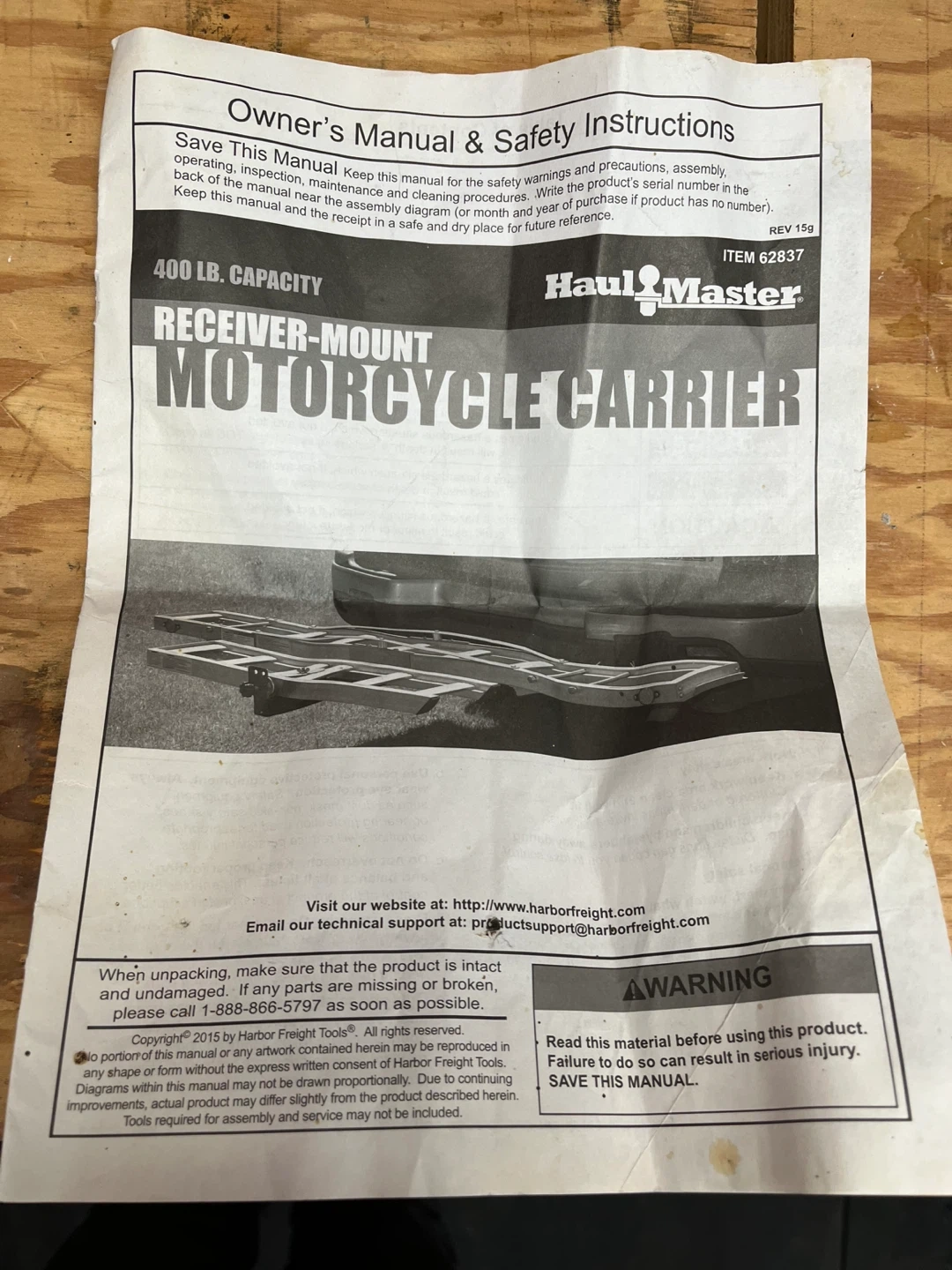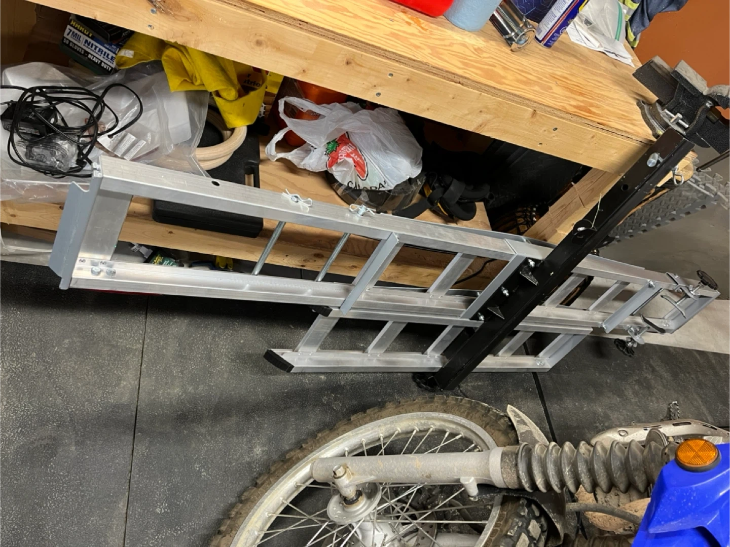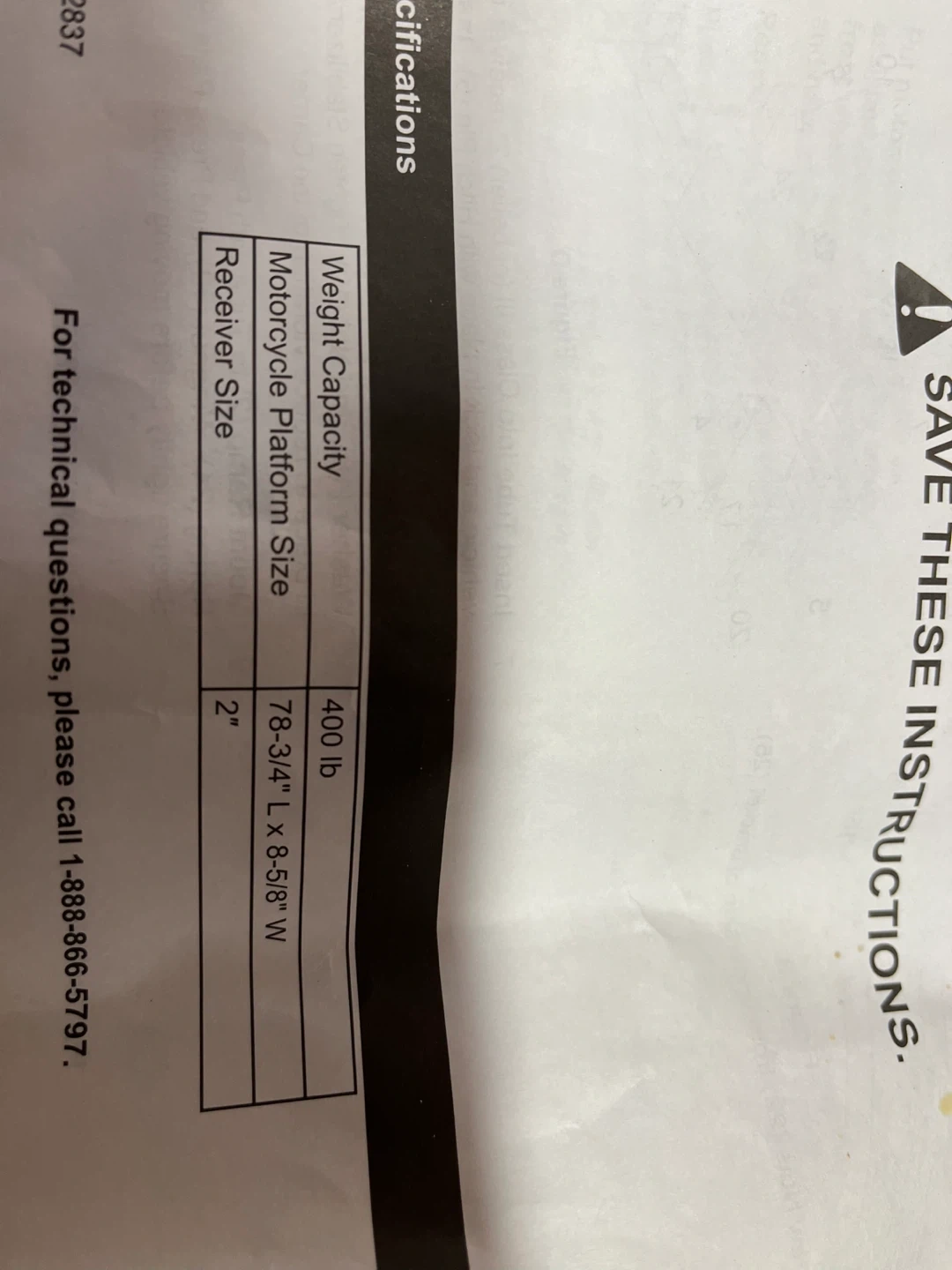 100Selling a Haul Master receiver-mount motorcycle carrier. It has a 400 lb capacity and the motorcycle platform size is 78-3/4" L x 8-5/8" W. The receiver size is 2".