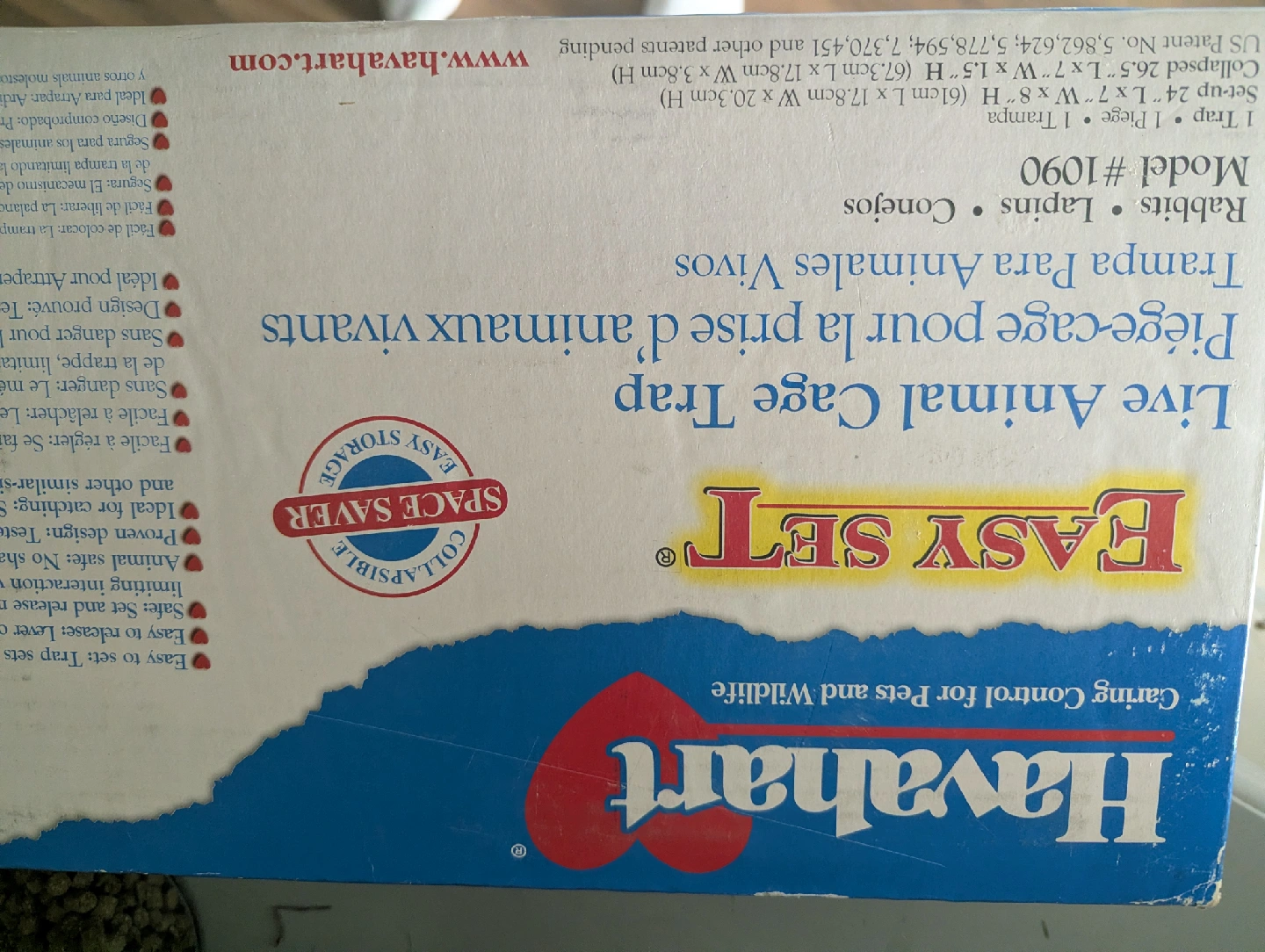 65*Brand New* Unopened box. Havahart Easy Set Live Animal Cage Trap, model #1090. It's designed for the safe capture and release of small animals. The trap is collapsible for space-saving storage, and it's easy to set and release. Dimensions: - Set-up: 24" L x 7" W x 8" H (61cm L x 17.8cm W x 20.3cm H) - Collapsed: 26.5" L x 7" W x 1.5" H (67.3cm L x 17.8cm W x 3.8cm H)