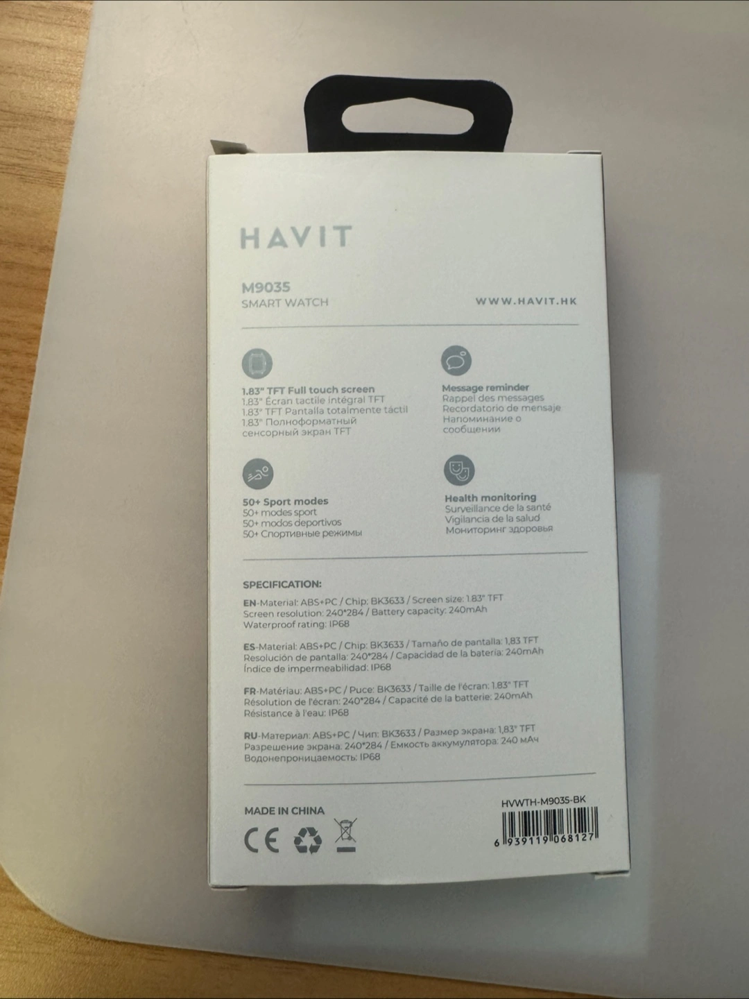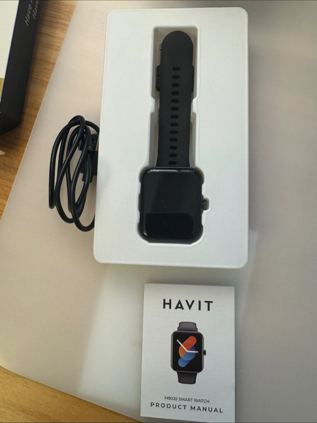 218Brand new HAVIT M9035 smart watch. Features a 1.83" TFT full touch screen, 50+ sport modes, and IP68 waterproof rating. Includes charging cable and manual. Pickup only