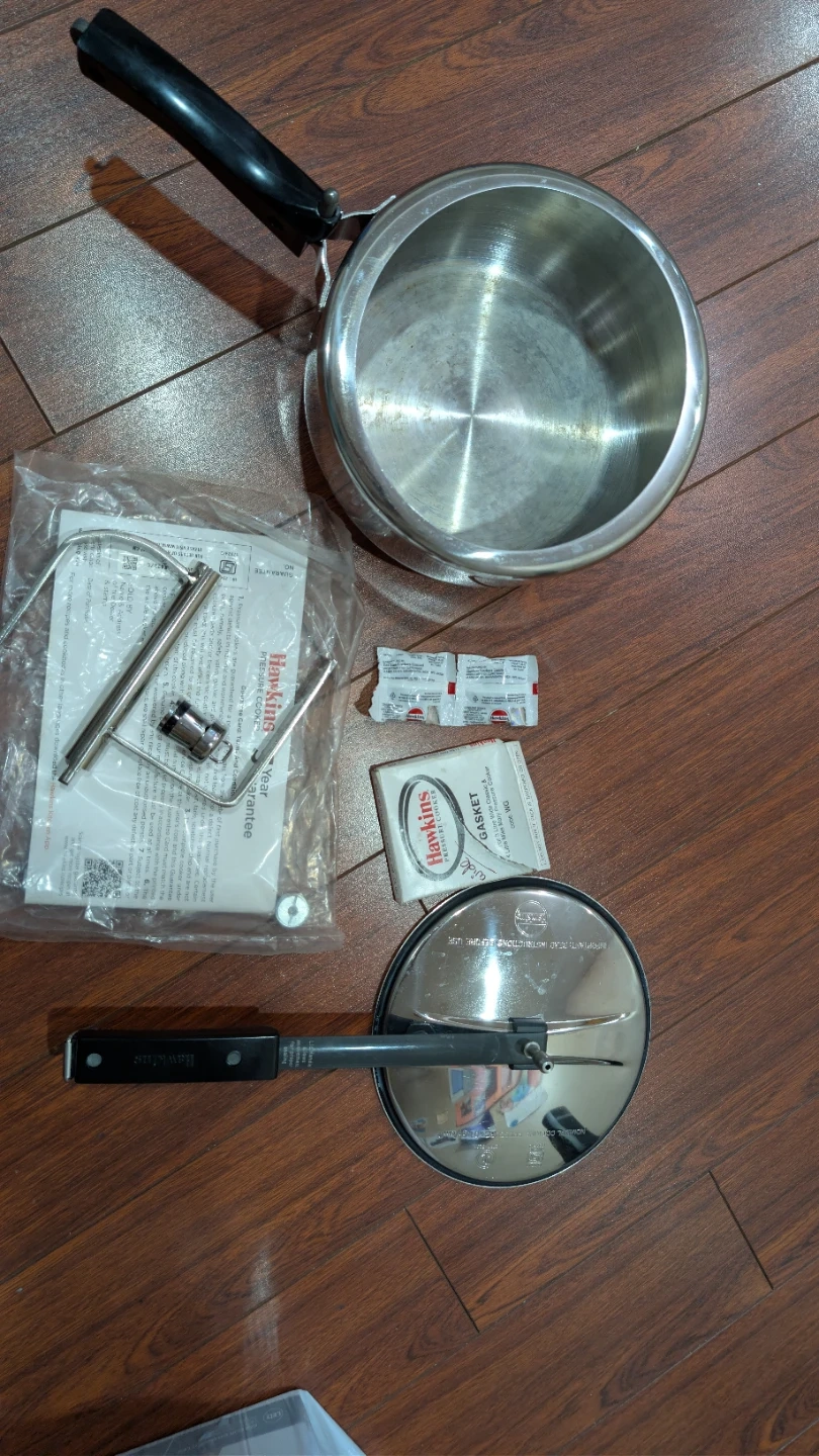 60Selling a Hawkins stainless steel pressure cooker with a 3-litre capacity. It's in good condition and ready for your kitchen! Includes the original parts and accessories.