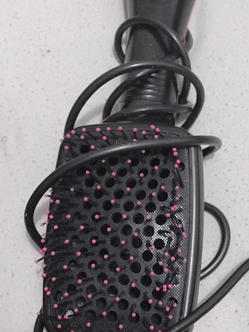 This black blow drying brush features numerous ventilation holes for faster drying. It has pink-tipped bristles designed to detangle hair. The brush's handle is wrapped with its power cord.