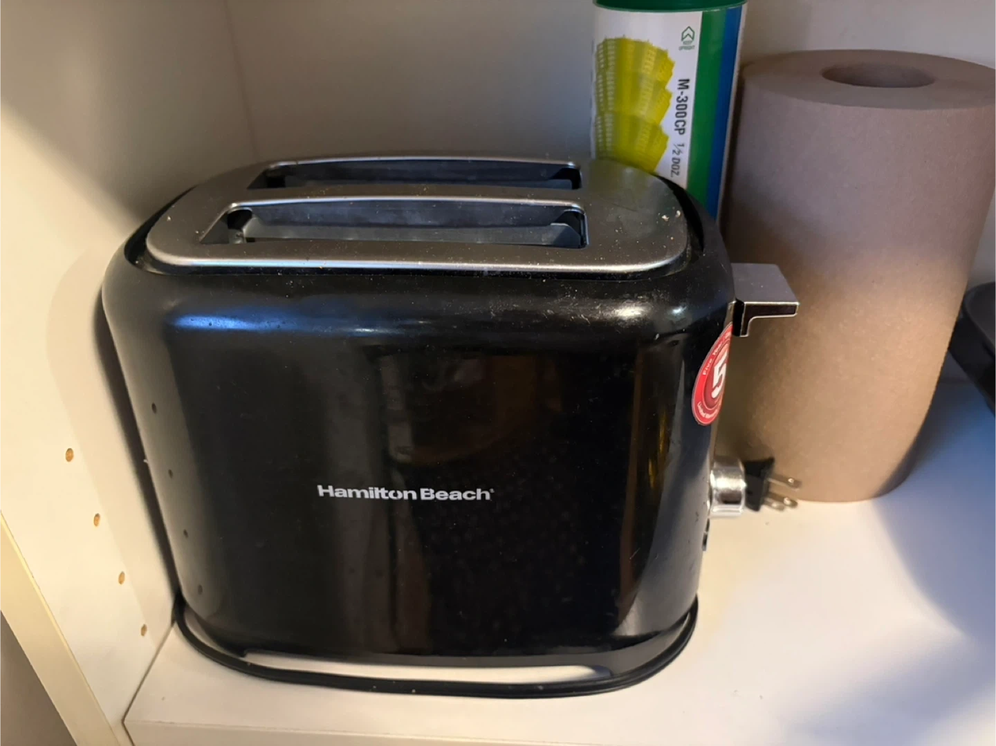 Selling a Hamilton Beach toaster in black. It's in good condition and ready to toast your favourite breads and pastries. Perfect for any kitchen!