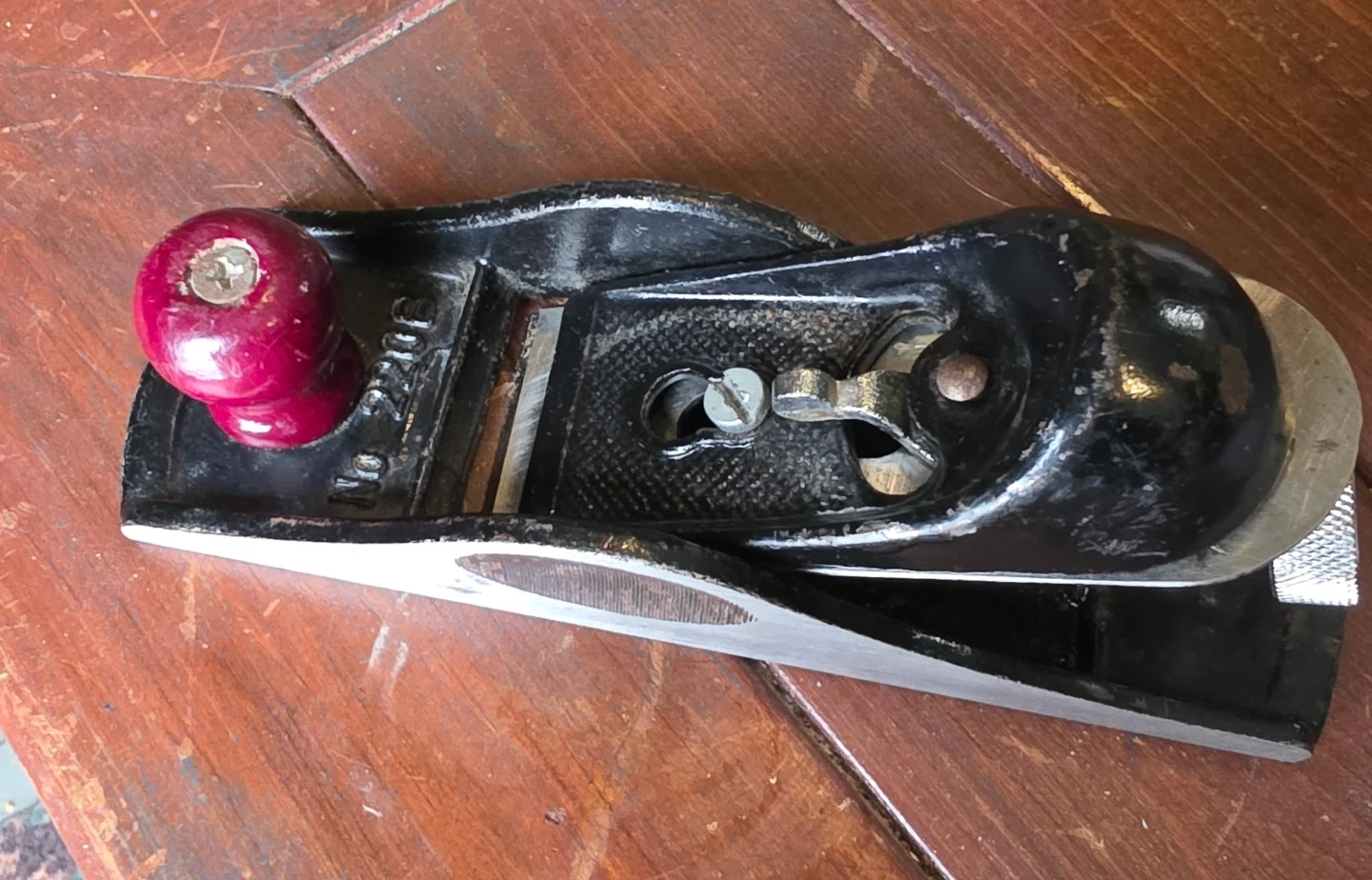 This is a vintage hand plane with a black painted body and a red knob. It's marked "No. 220B" on the side. This tool is great for woodworking and shaping small pieces of wood. It's made for fine detail work.