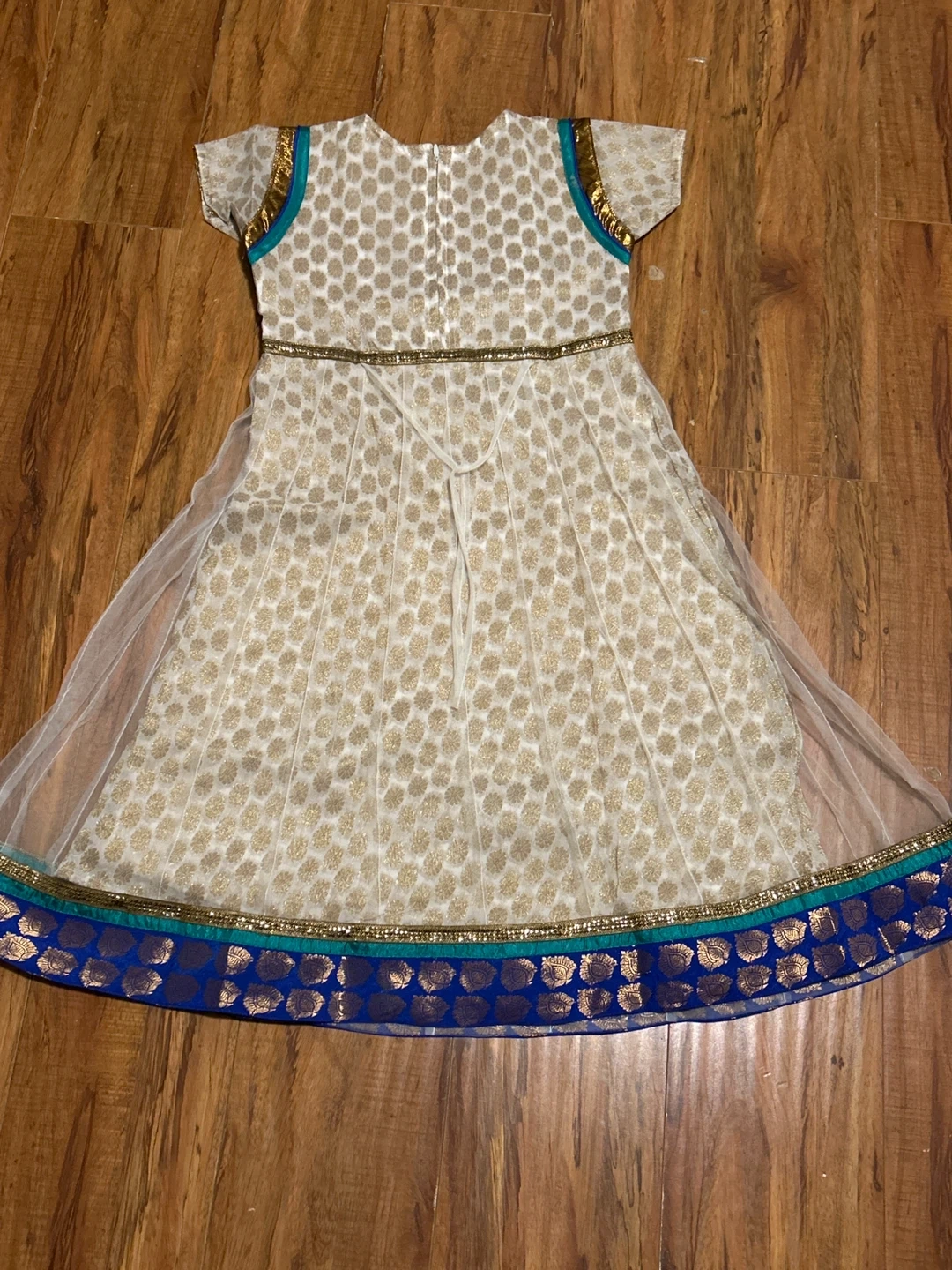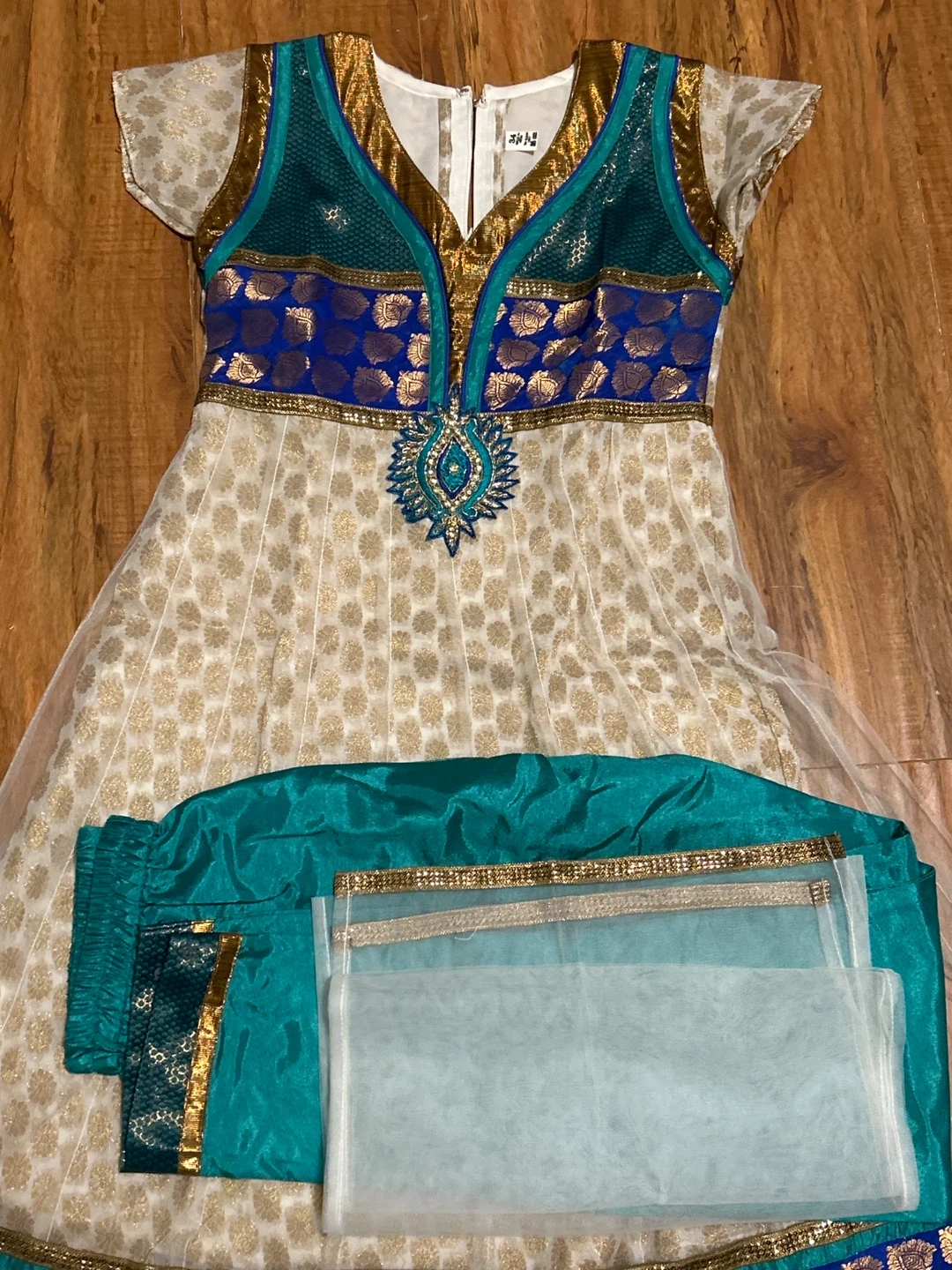 This is a festive girls' kurti set with matching pants and a sheer dupatta. It's adorned with gold thread work and blue and teal accents. The outfit includes a sleeveless kurti, pants, and a dupatta.