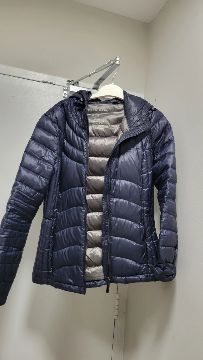 Andrew Marc packable down jacket in navy. Lightweight and compressible for easy travel. Made with premium down for superior warmth. It's a size M/M.