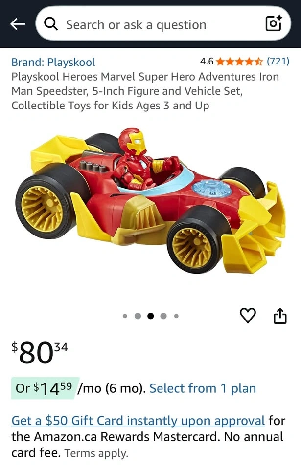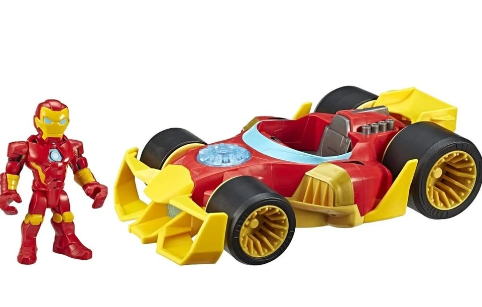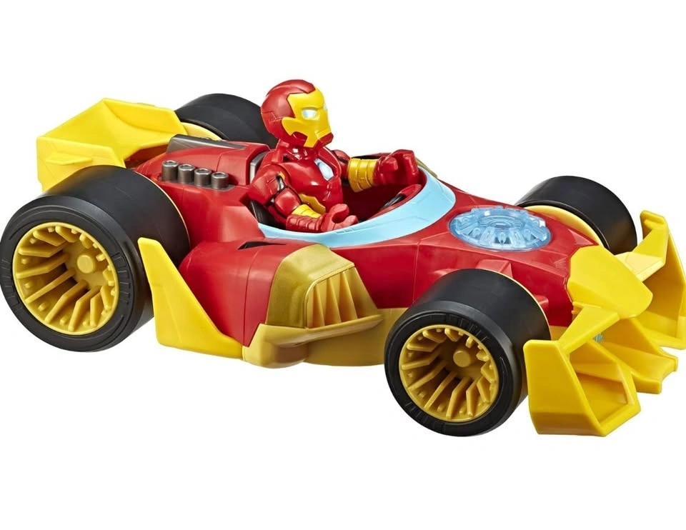 The vehicle has smooth wheels, and the Iron Man figure has a movable head, arms, and legs.