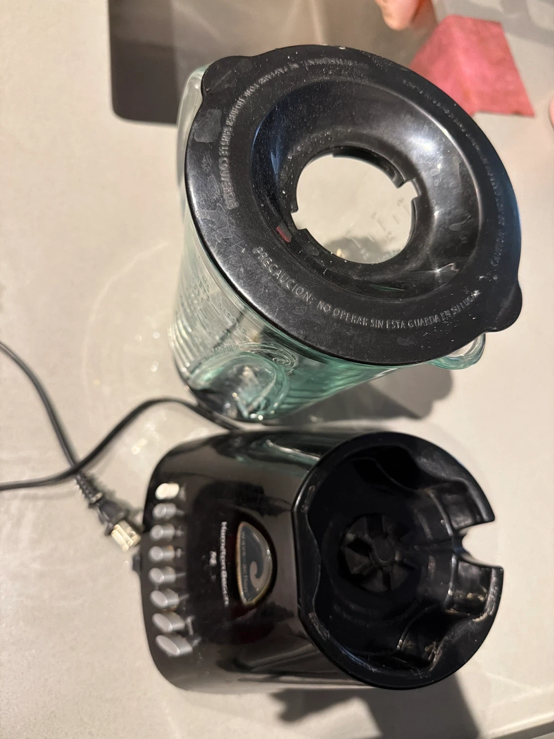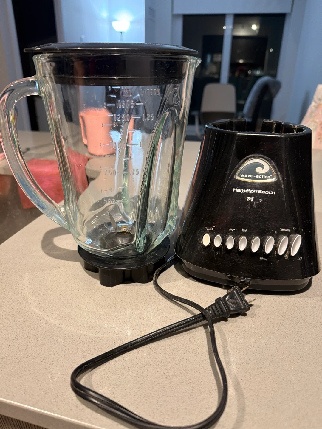Hamilton Beach Wave Action blender with a glass jar. It has multiple speed settings for blending. Great for smoothies and other kitchen tasks! Works fine.