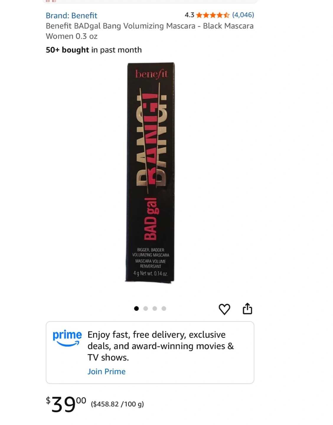 Benefit BADgal BANG! Bigger, Badder Volumizing Mascara in black. This mascara offers 36-hour full-blast massive volume without weighing down lashes! It is smudge-proof and water-resistant.