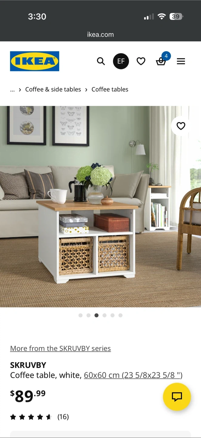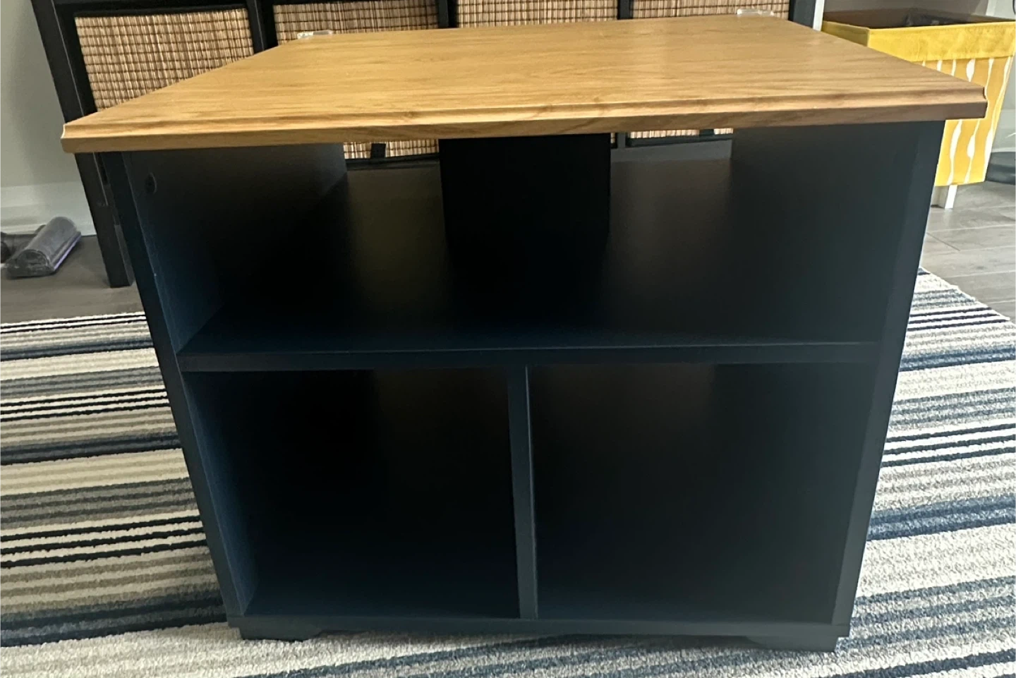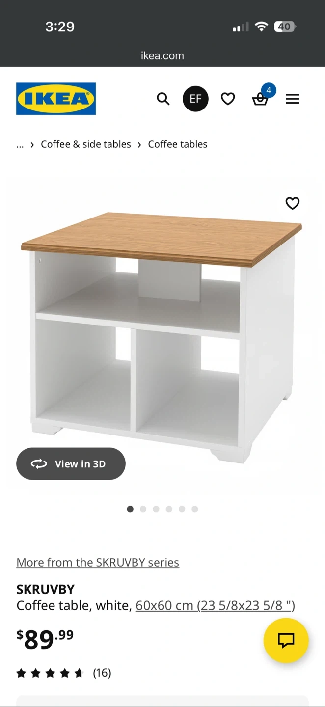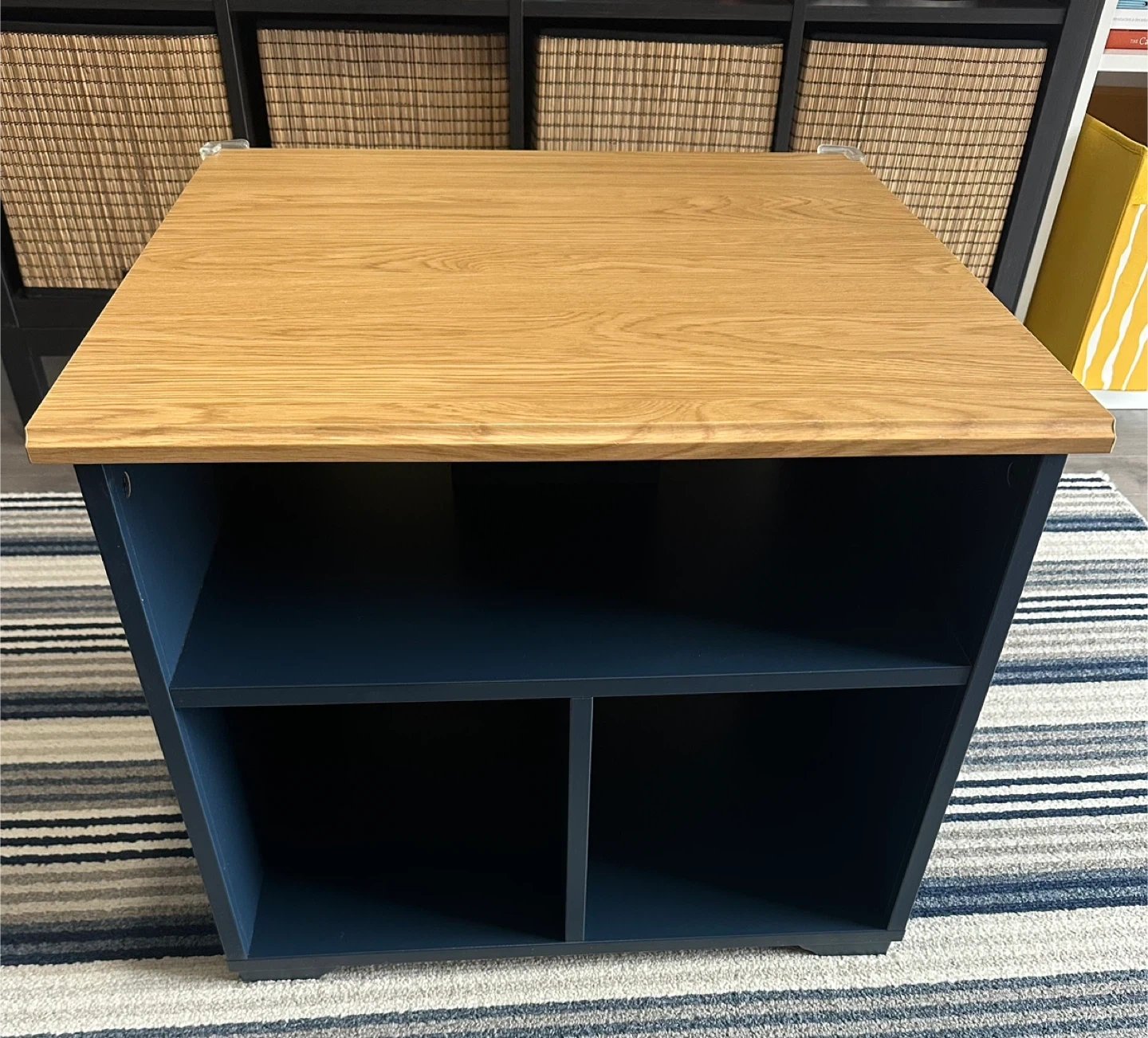 This IKEA SKRUVBY coffee table features a natural oak top with a dark blue base. It offers two open shelves for storage. It's a sturdy and stylish addition to any living room!